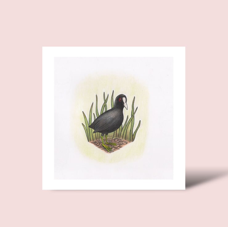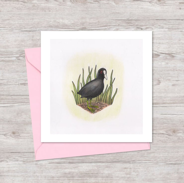 An original art greeting card, featuring a hand drawn pencil illustration of a small coot in the reeds, on the Norfolk Broads.