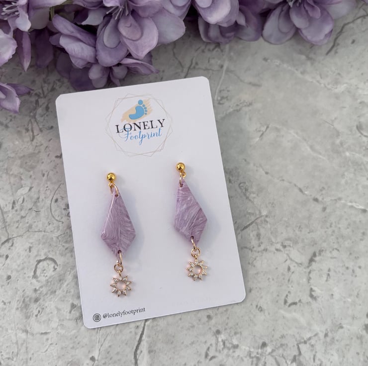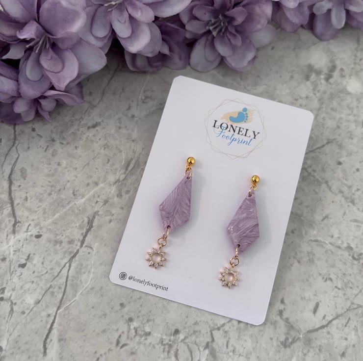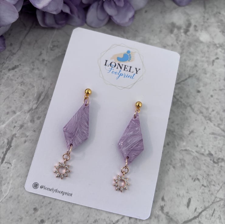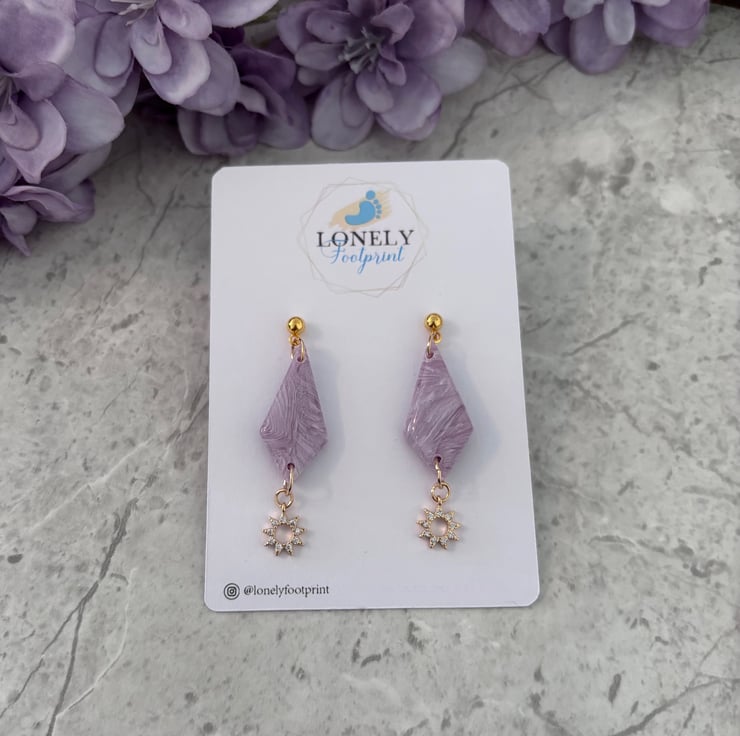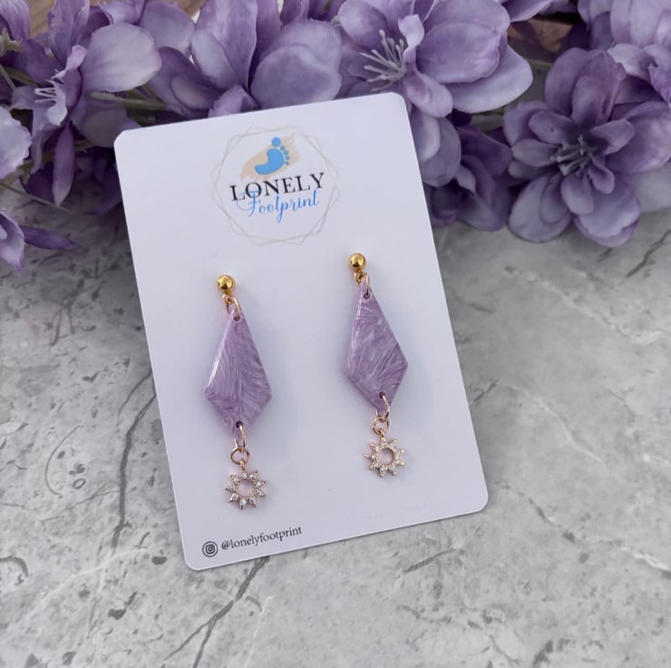 These handmade lilac polymer clay earrings feature a kite shape with a marbled texture and finished with a sparkling zircon sun charm, they’re lightweight, elegant, and perfect for treating yourself or gifting someone special.