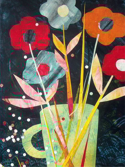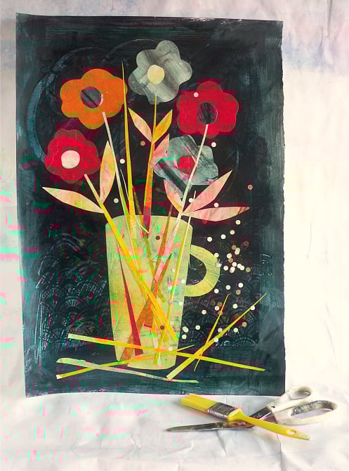 Collage made using cut out paper from my screen prints and paste paper. Assembled with care for this unique original piece.