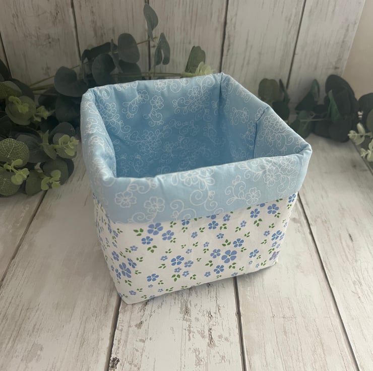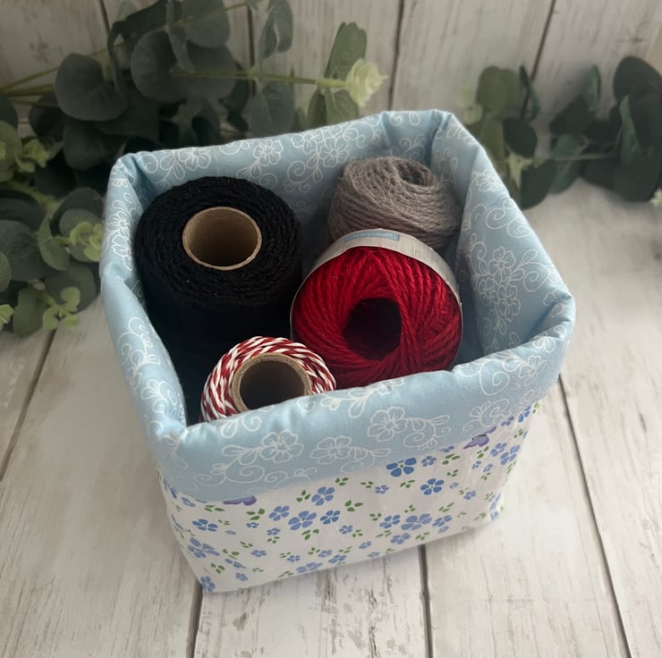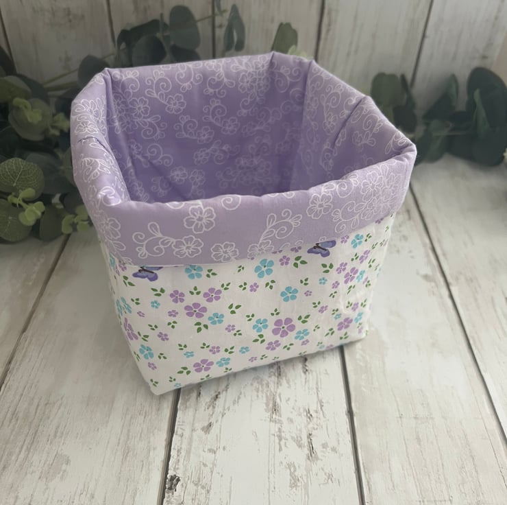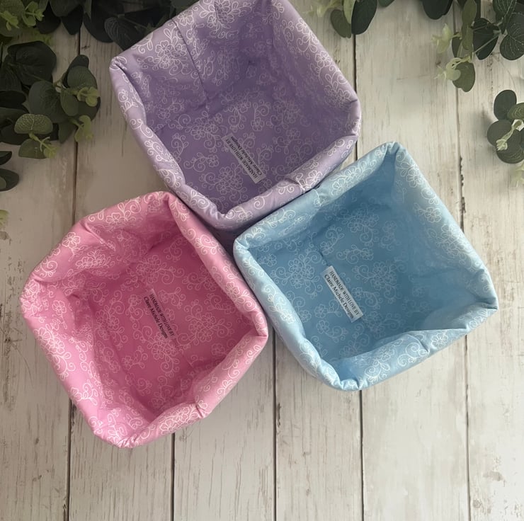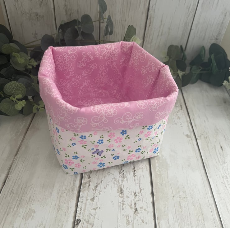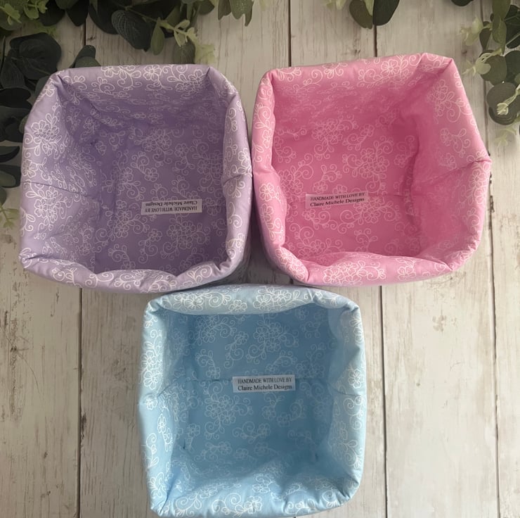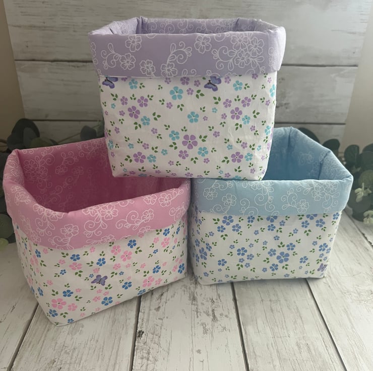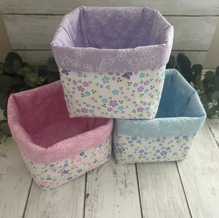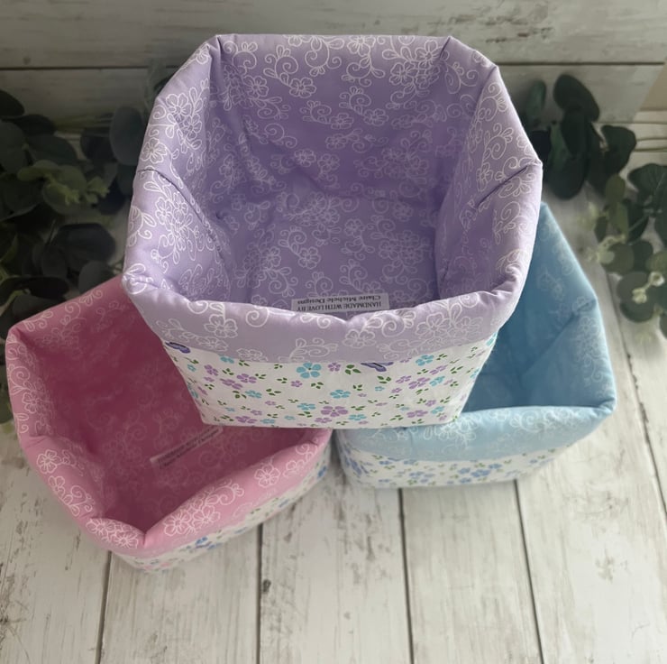 Handmade fabric storage baskets in 100% cotton pastel floral and co-ordinating inner fabric.