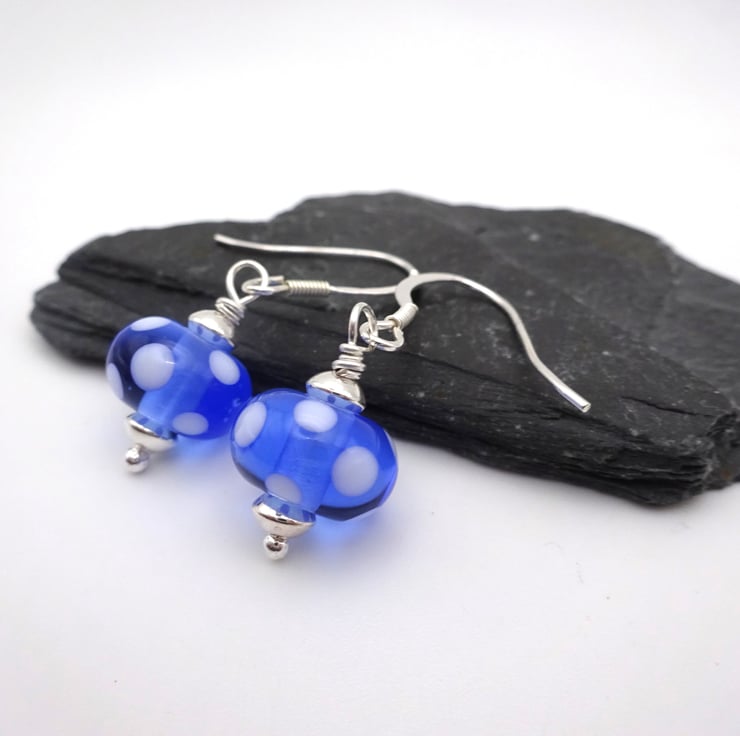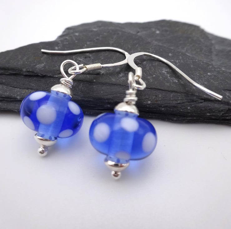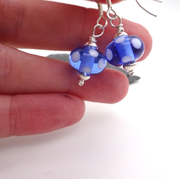 A pair of earrings made with sterling silver ear wires and handmade lampwork glass blue and white polka dot beads.