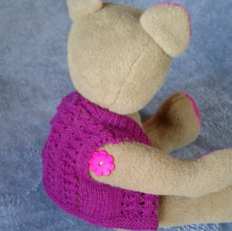 Crumble is 15 inches tall with stitched in legs and flower button jointed arms, she has a joint in the neck so is very posable and cuddly. All hand made including the little wool waistcoat which she sometimes likes to wear casually with the buttons undone. A bear with a lot of character with embroidered features and button eyes stitched in. A great gift for many ages except the very young due to small parts.