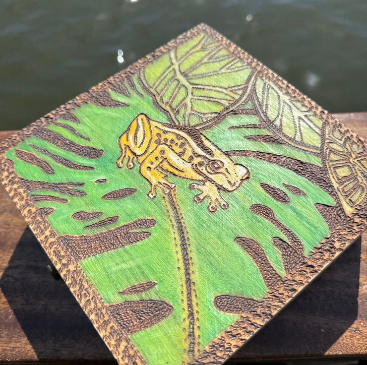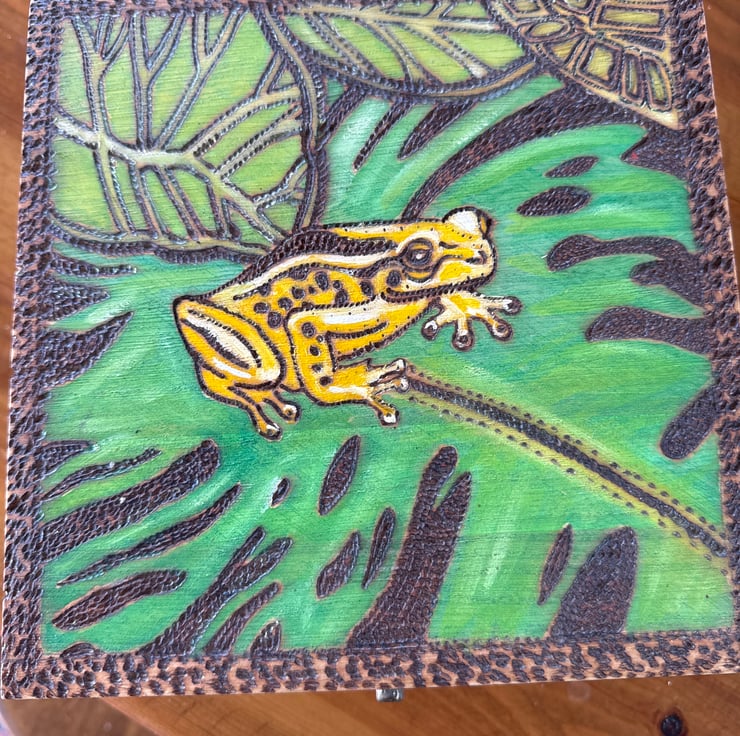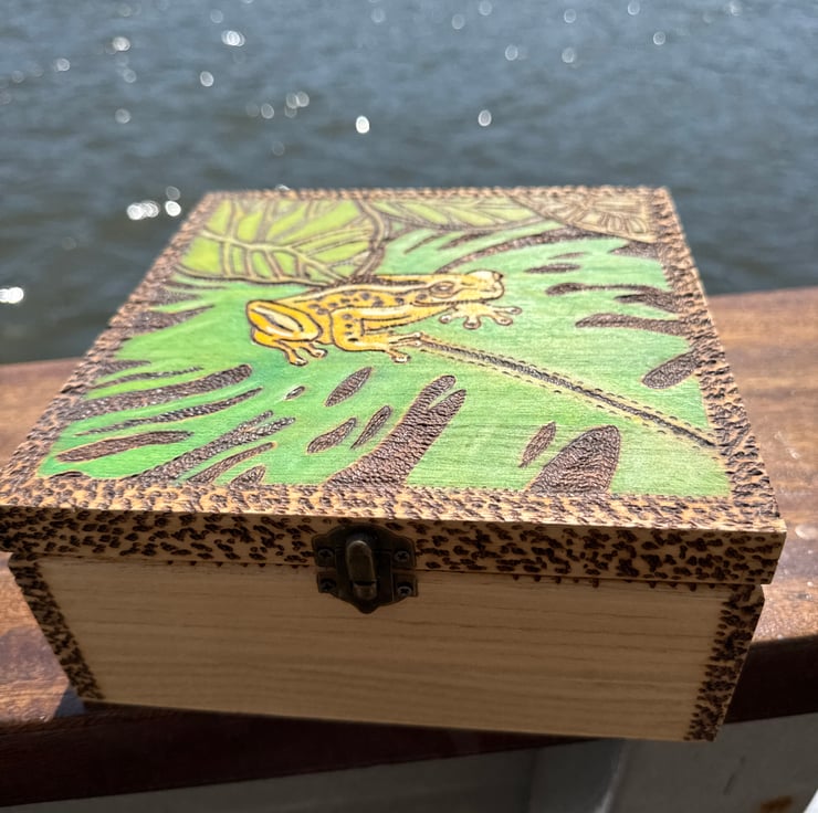 This lovely burned and painted box has a poison dart frog burned upon its lid. The illustration is painted with acrylic paint.