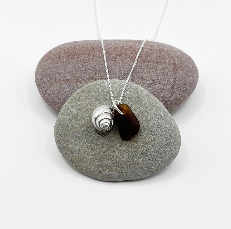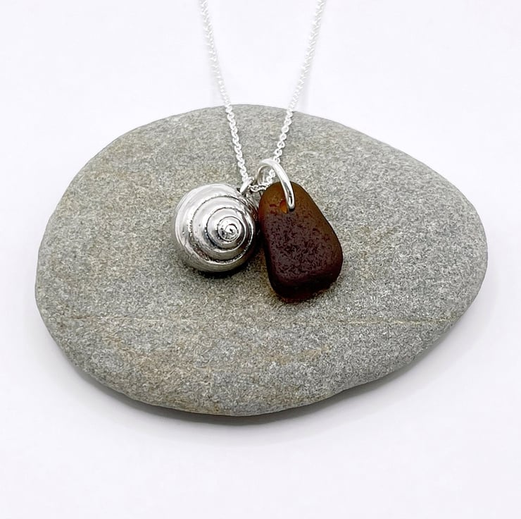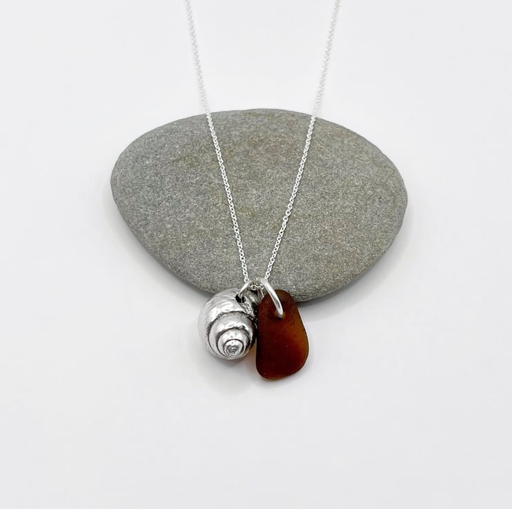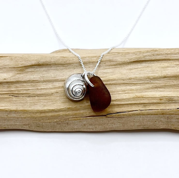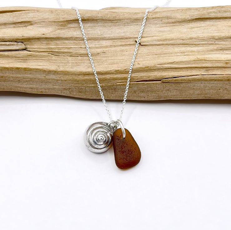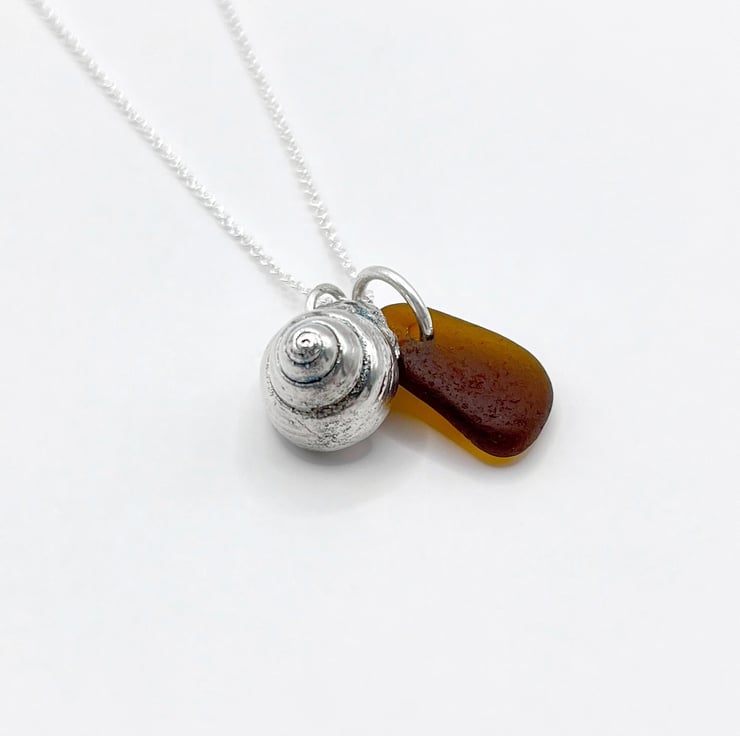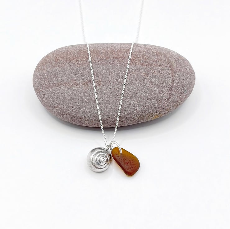 Silver coated Venetian Seashell paired up with a piece of burnt orange coloured Cornish Sea Glass. I have added these on to an 18" Eco sterling silver fine chain necklace.