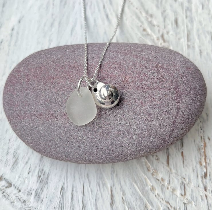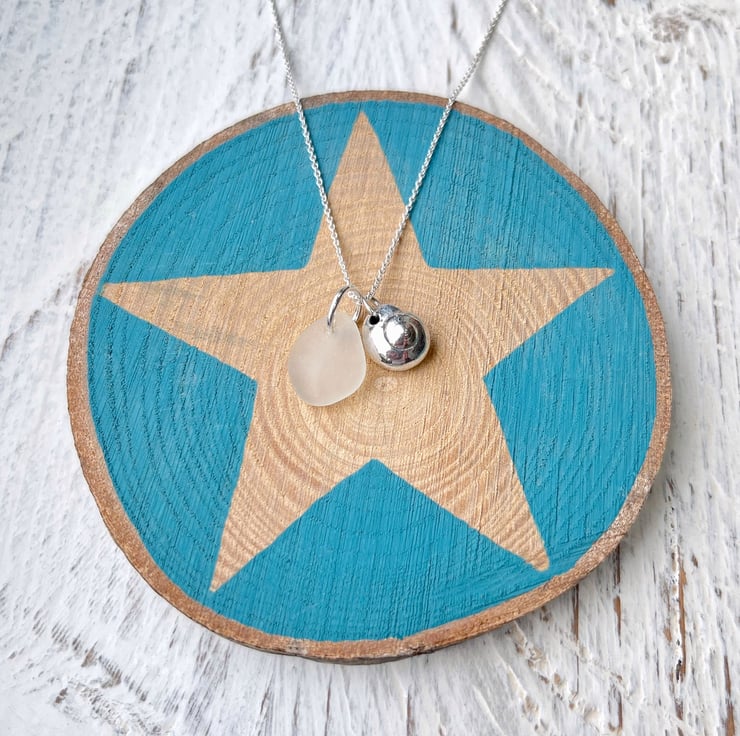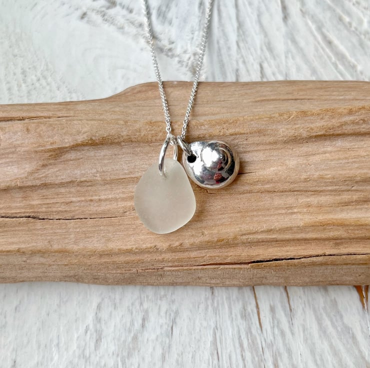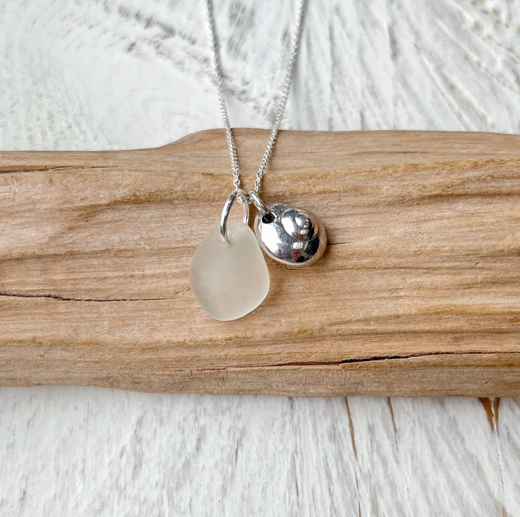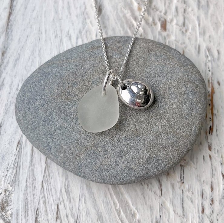 Silver coated Button Top Seashell paired up with a piece of white Cornish Sea Glass. I have added these on to an 18" Eco sterling silver fine chain necklace.