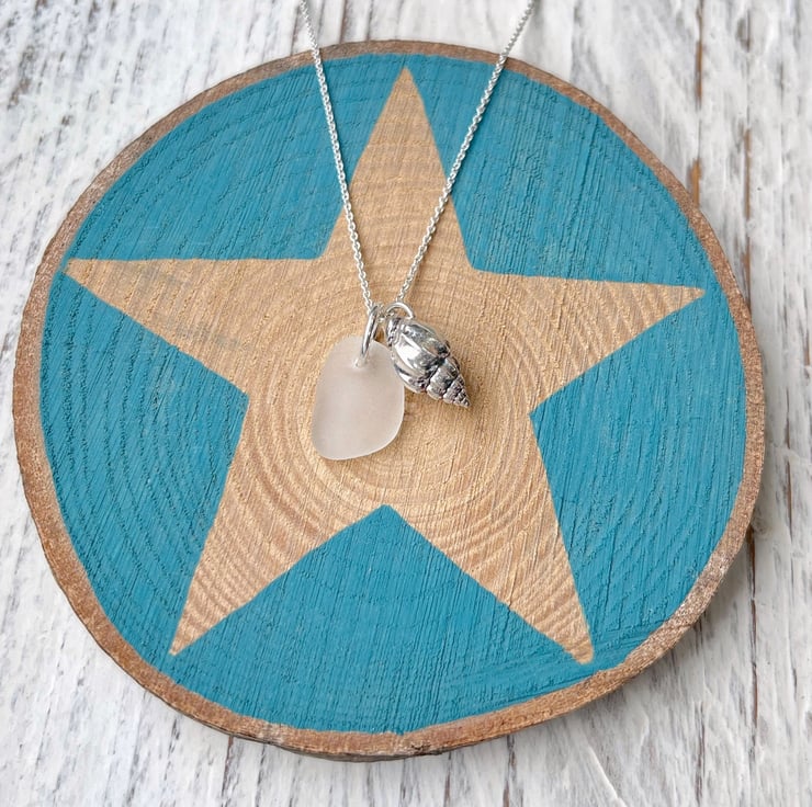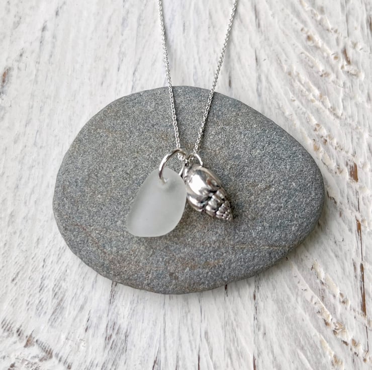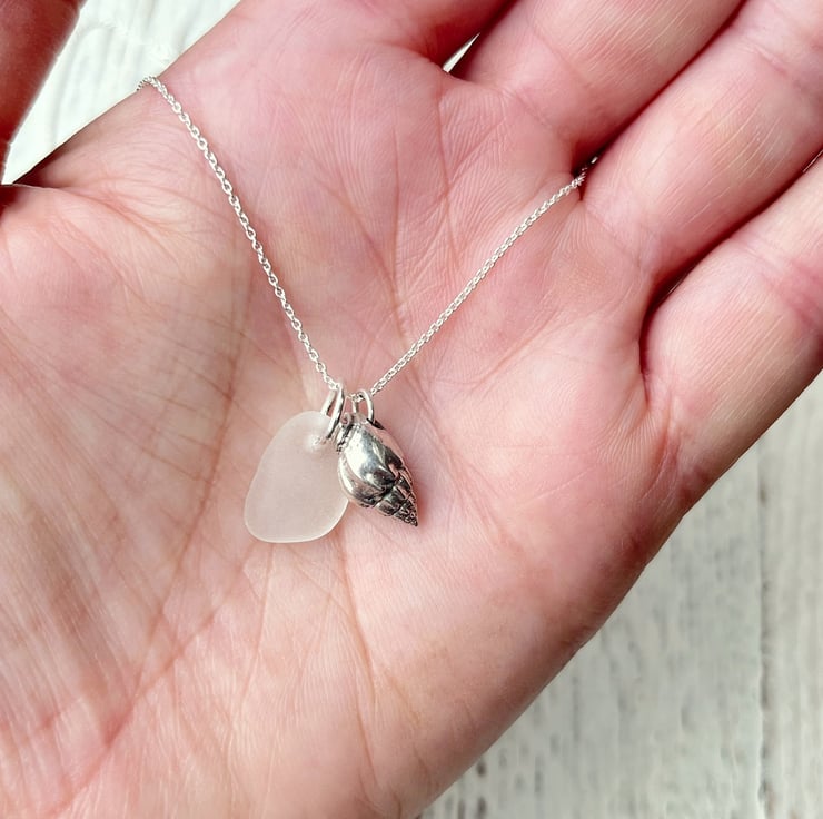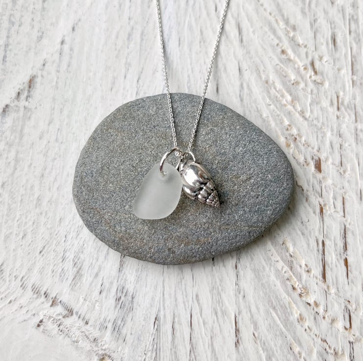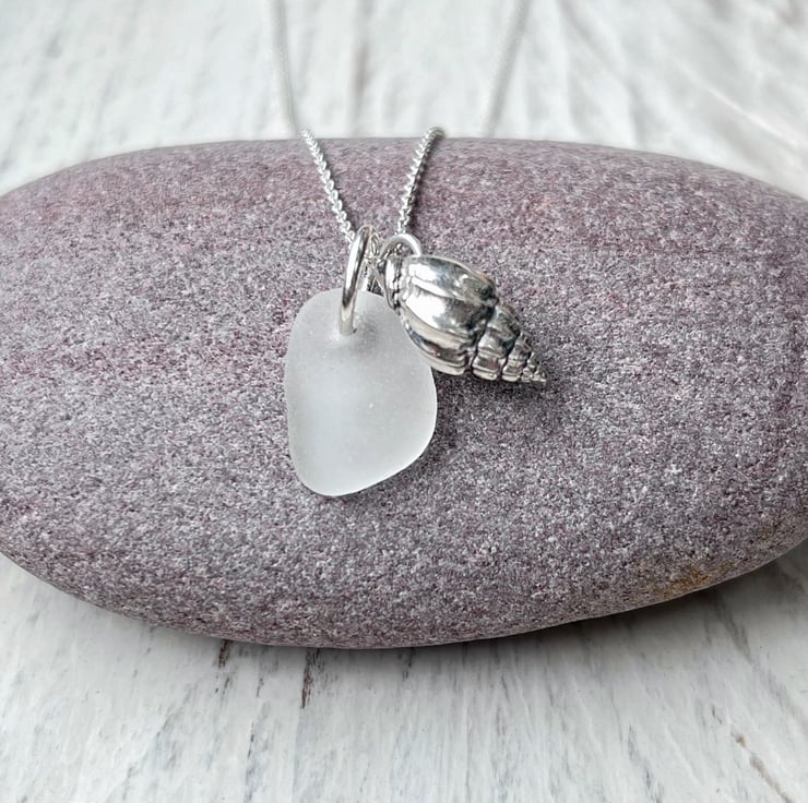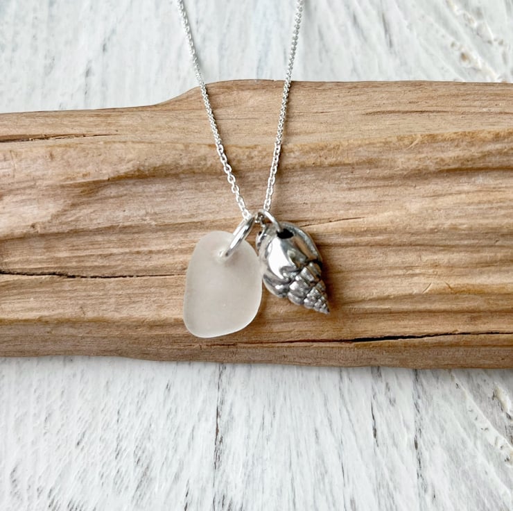 Silver coated Little Bear Conch Seashell paired up with a piece of white Cornish Sea Glass. I have added these on to an 18" Eco sterling silver fine chain necklace.