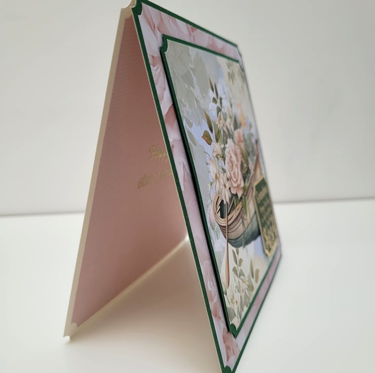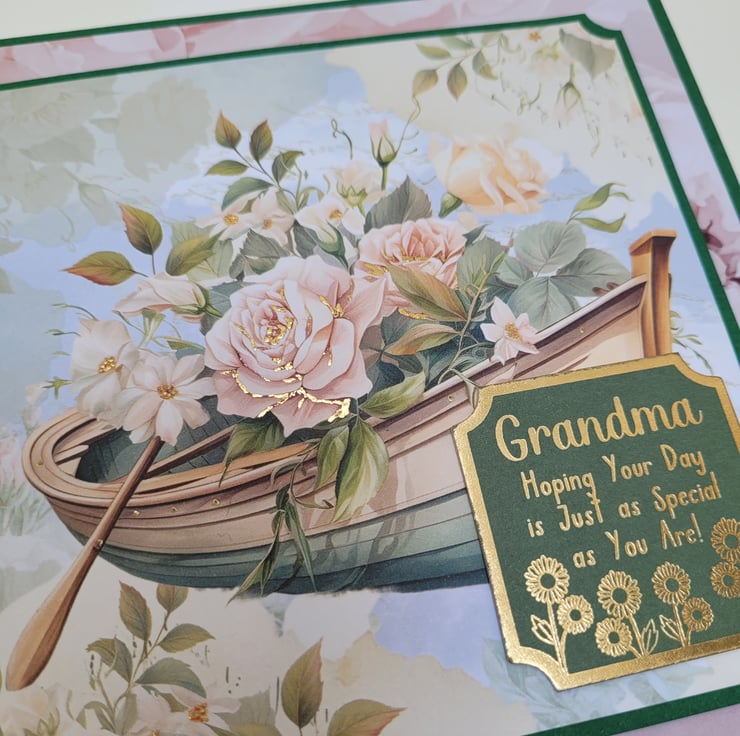 Featuring an image of a boat surrounded by floral blooms, this handmade card in a soft pink and cream tones has been accented with dark green as well as gold foiling. A lovely choice to wish a special grandma a happy birthday.
