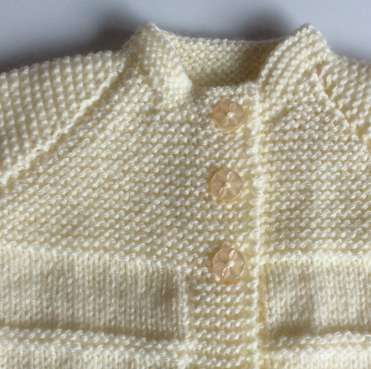 Lovely soft baby cardigan hand knitted by me in my smoke and pet free home. I have followed one of my favourite traditional style vintage patterns to knit this using a good quality baby yarn that gentle and non irritating for a baby’s delicate skin. Fastens with three matching buttons. Made to fit a baby from birth to three months but please check the size with these actual garment measurements