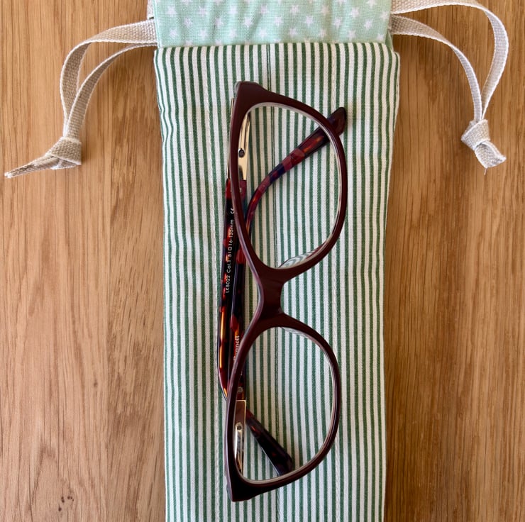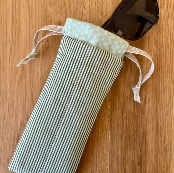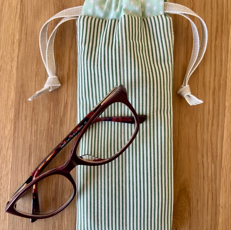 Handmade pouch for glasses or sunglasses. Beautiful soft cotton in a fresh green pinstripe, that is lightly padded to help keep your glasses safe from light bumps and scratches.
