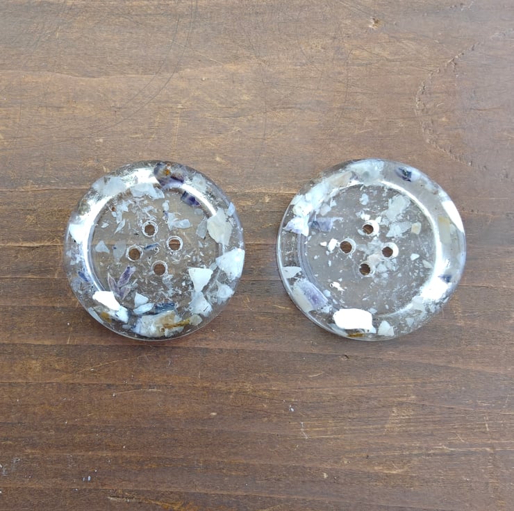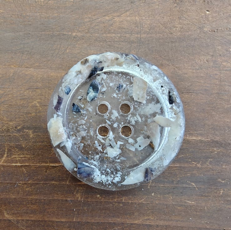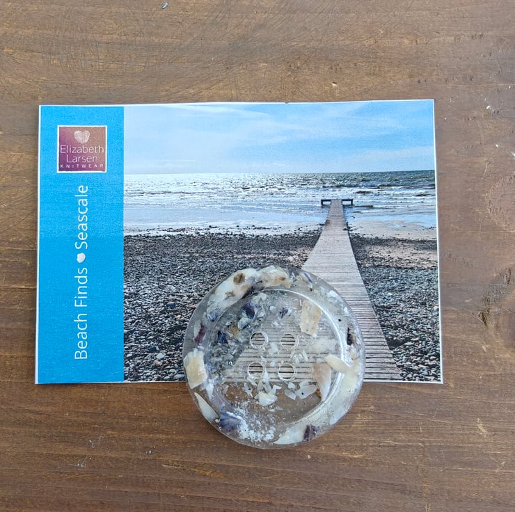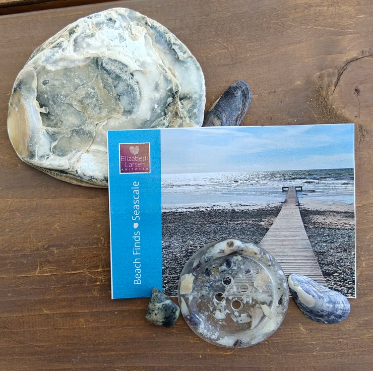Elizabeth Larsen Signature handcrafted buttons tnow available to purchase online. Each button is individually made and filled with sand and shells from Seascale in Cumbria. Perfect and unique decoration for your own knitwear, or bag, hat a piece of the seashore in a button.