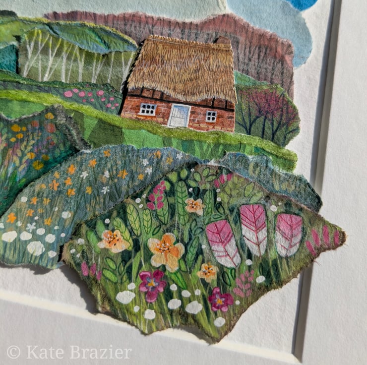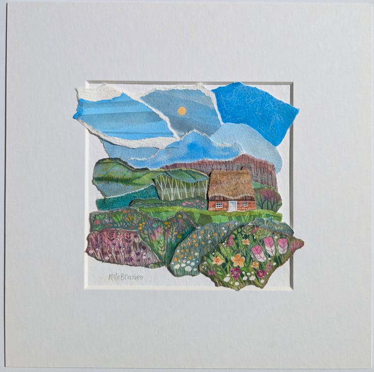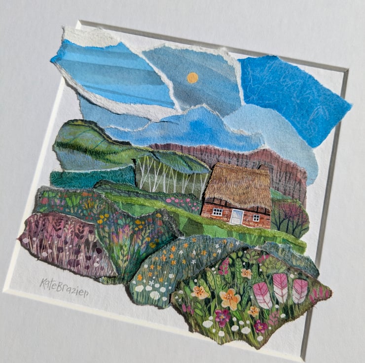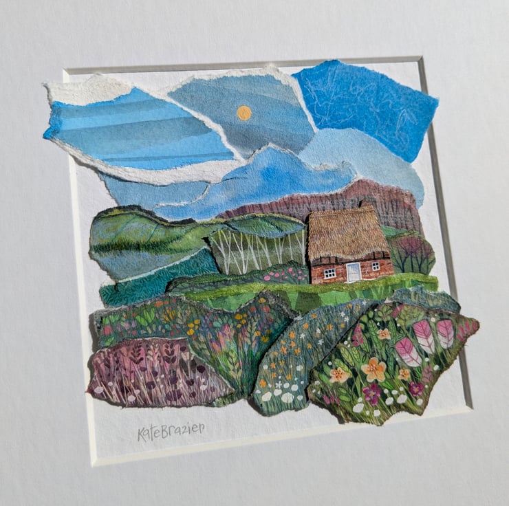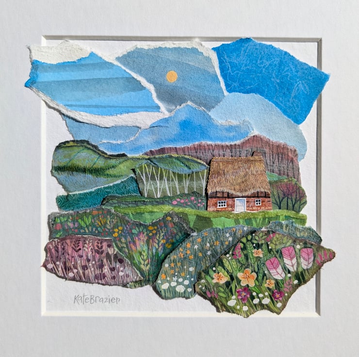 'Little Thatch' is an original paper collage, created using a mix of mediums - including gouache paints, water soluble pencils and different weight and texture of papers.