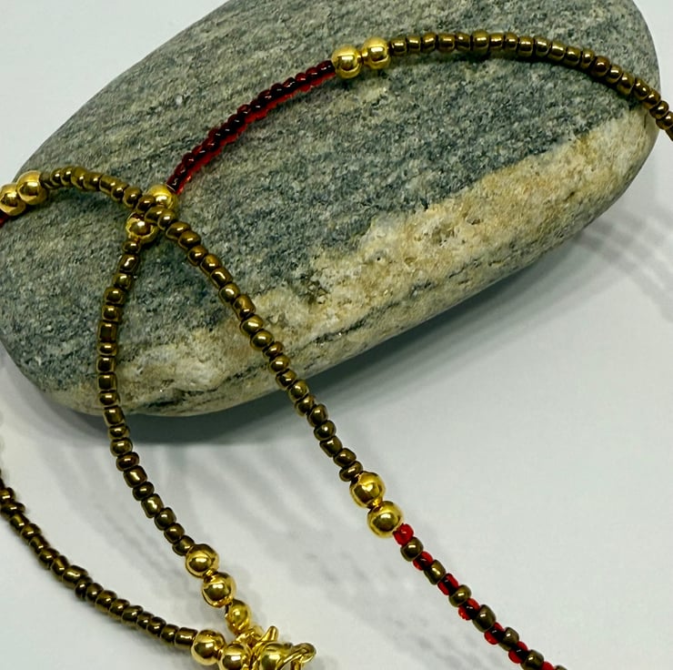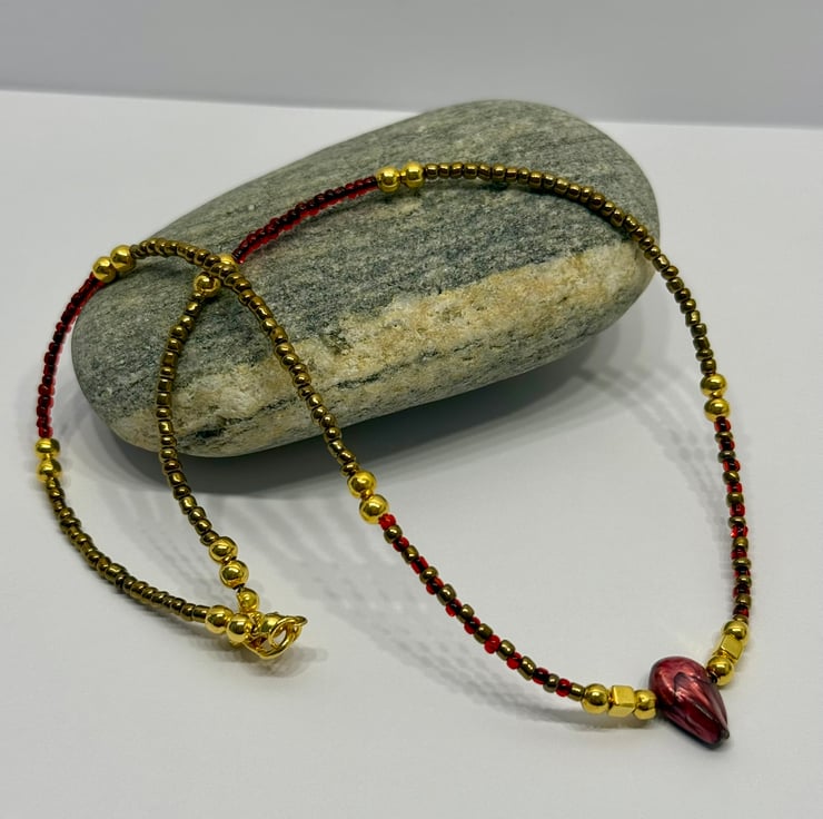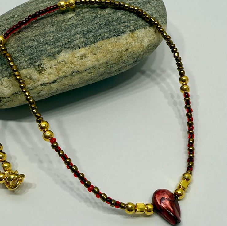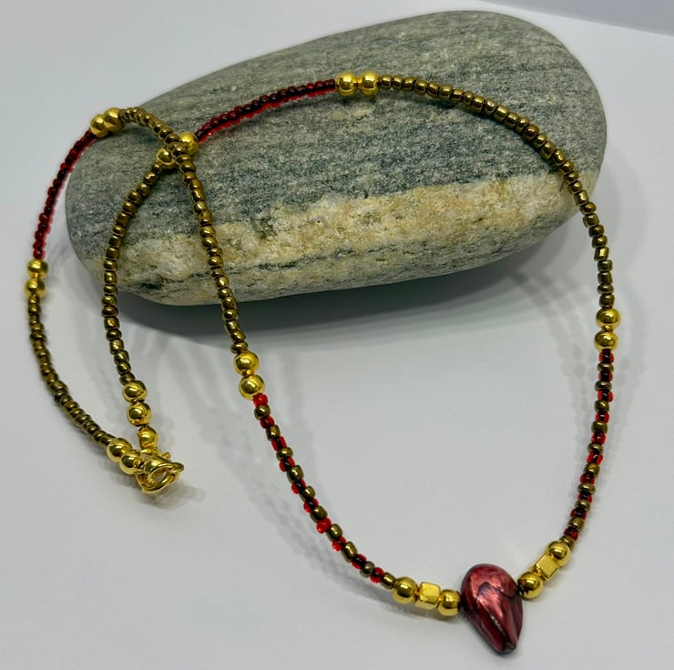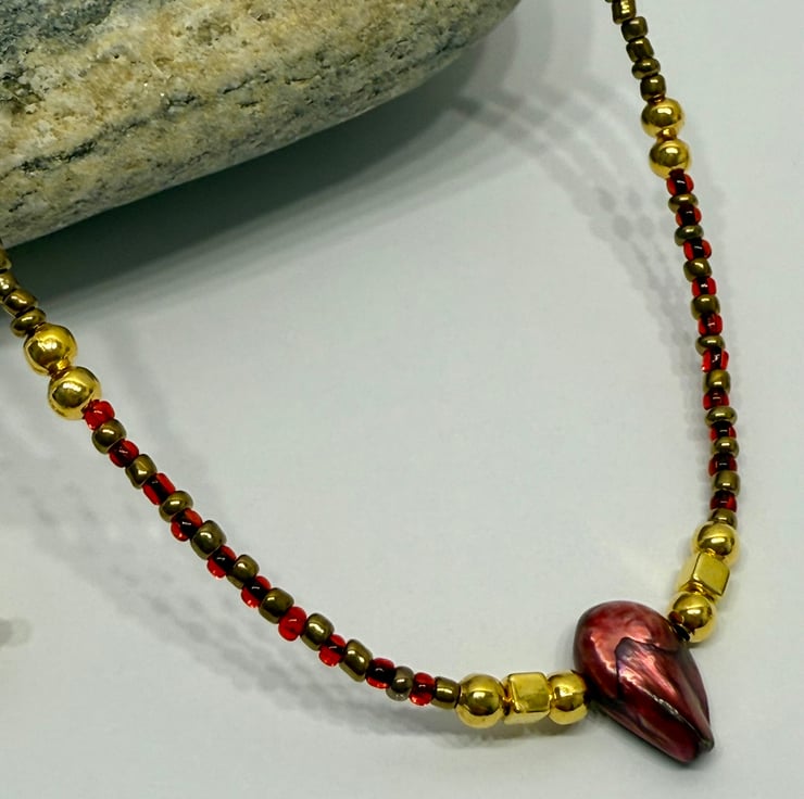 For my latest choker I thought that I would veer away from my normal silver and instead go with gold tones. For the centre piece l've used a baroque freshwater pearl in a gorgeous shade of deep red. The rest of the choker is made up of red and gold seed beads with other accents being gold tone stainless steel. If you like unique lightweight jewellery that can be worn from morning to night for many different occasions this is ideal, or gift it to someone that you know will like it !!