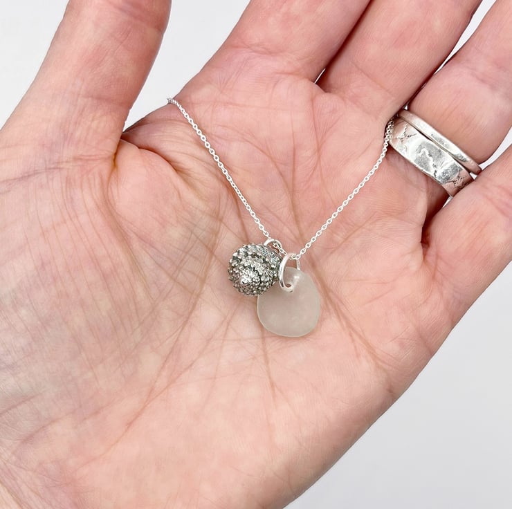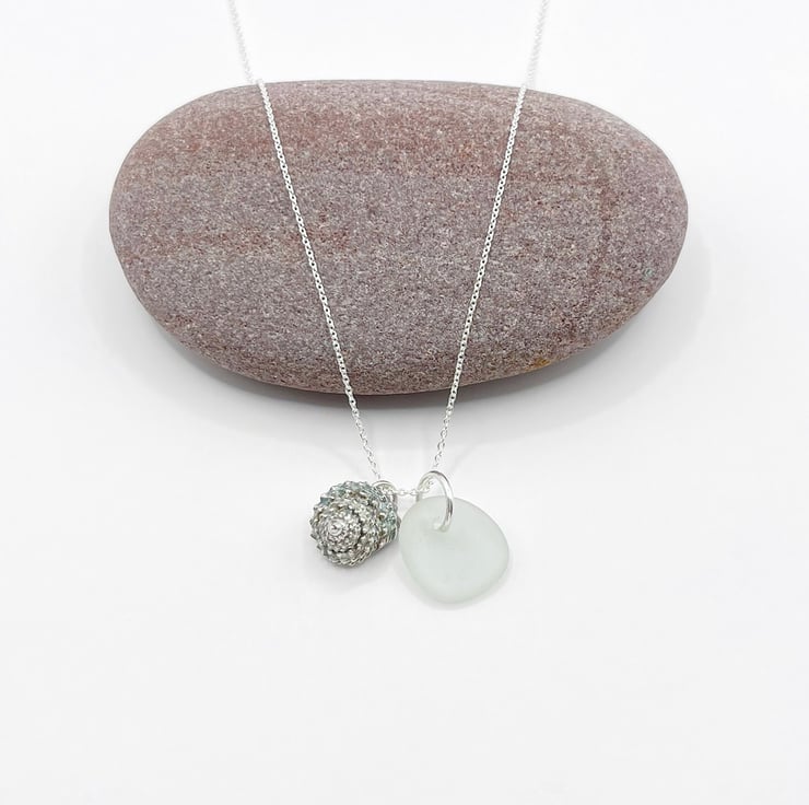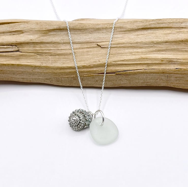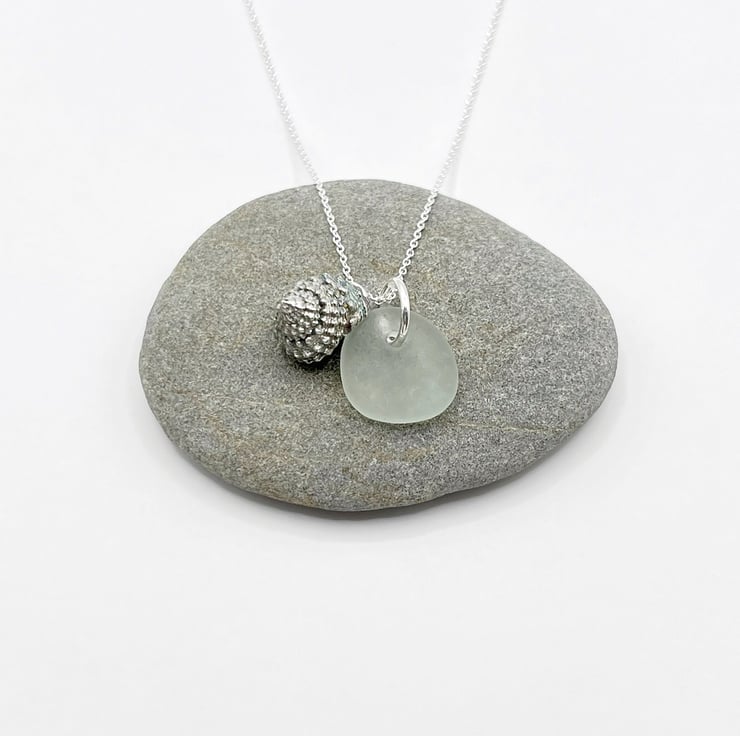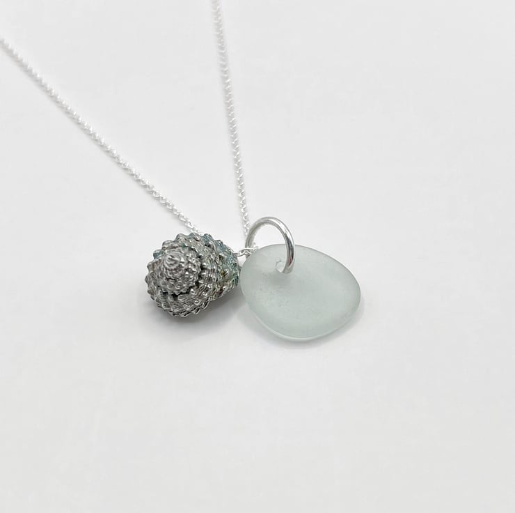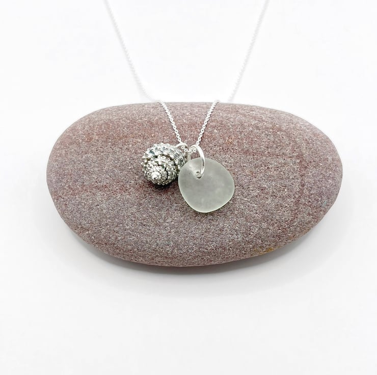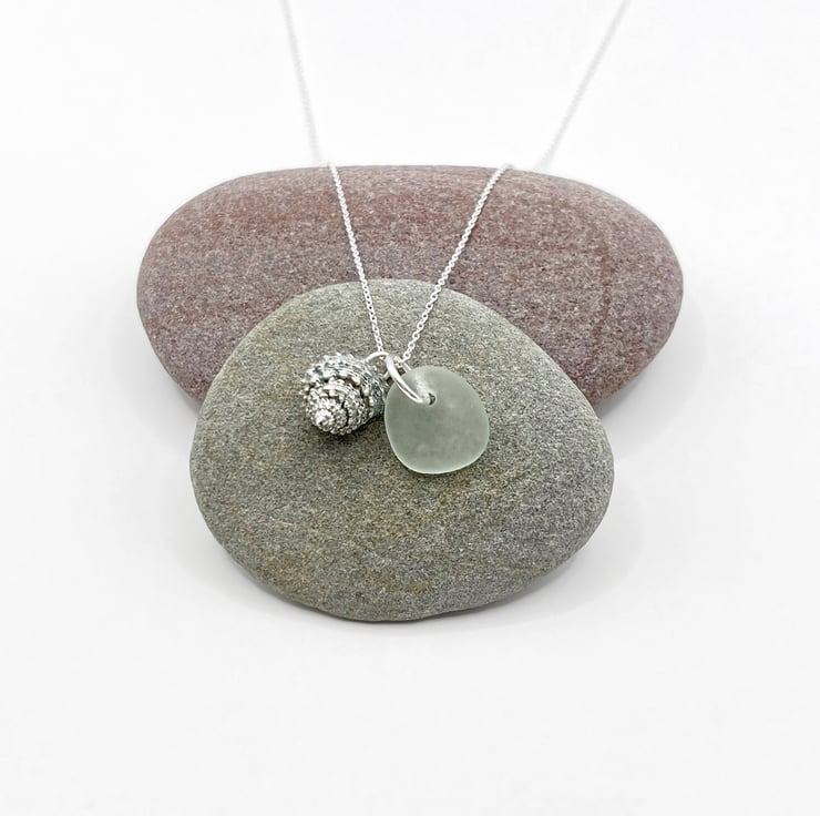Silver coated Strawberry Top Seashell paired up with a piece of pale sea foam coloured Cornish Sea Glass on an 18" Eco sterling silver fine chain necklace.