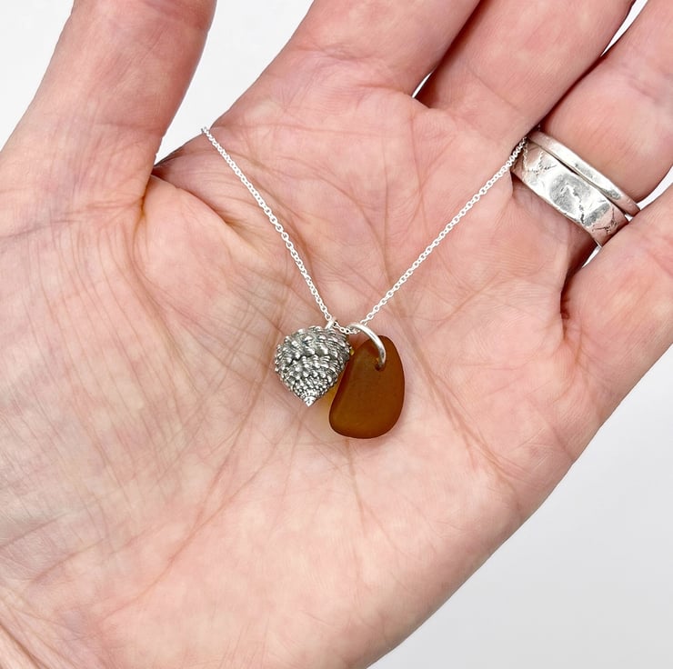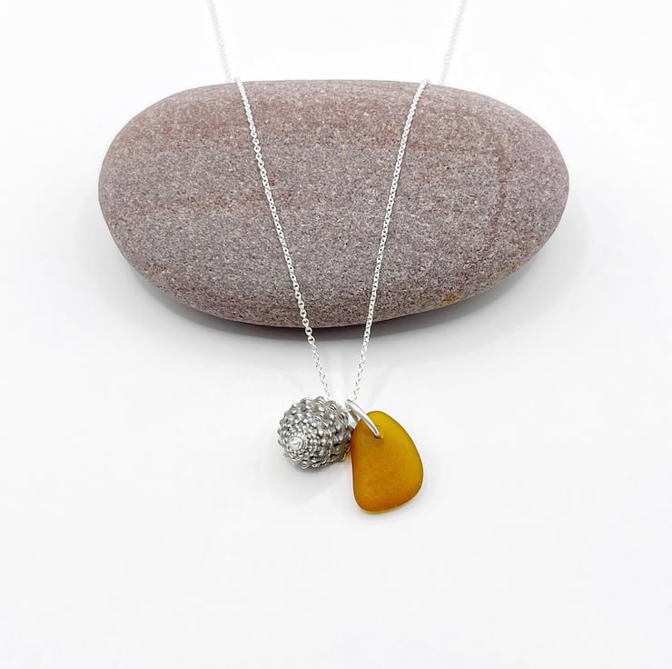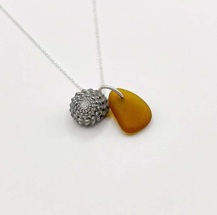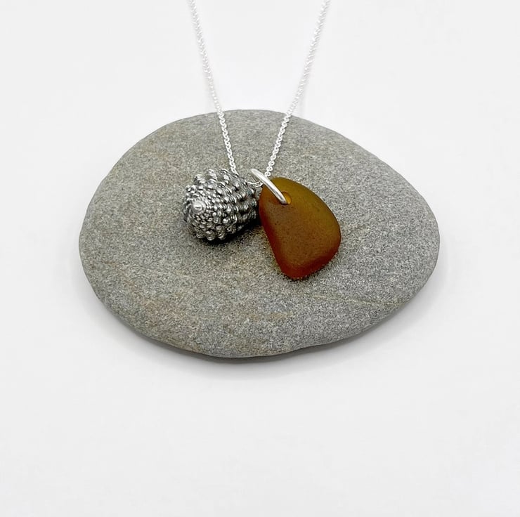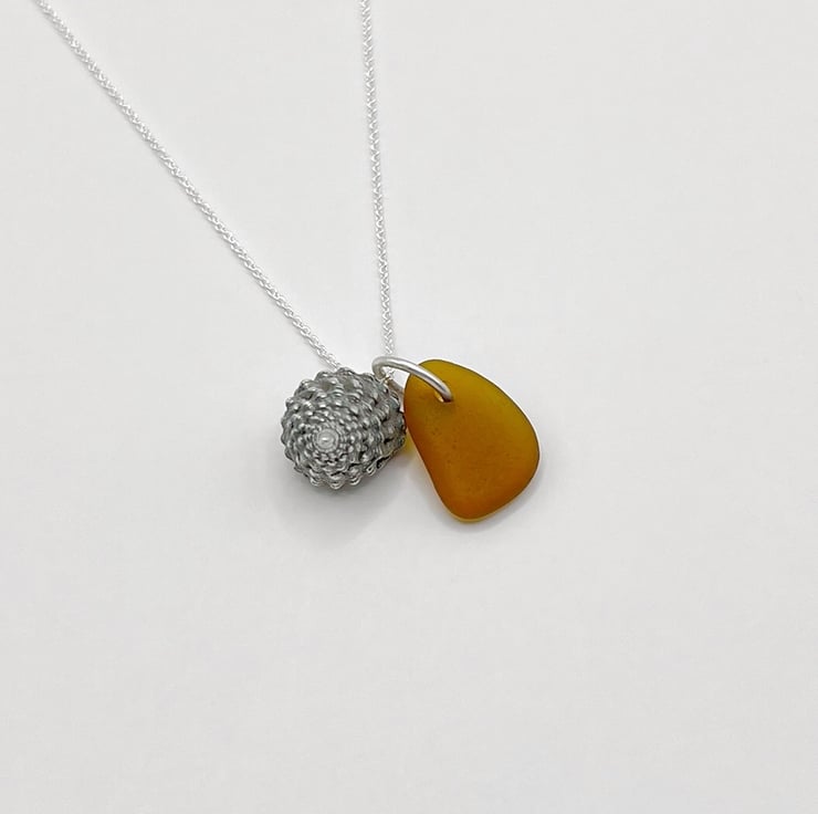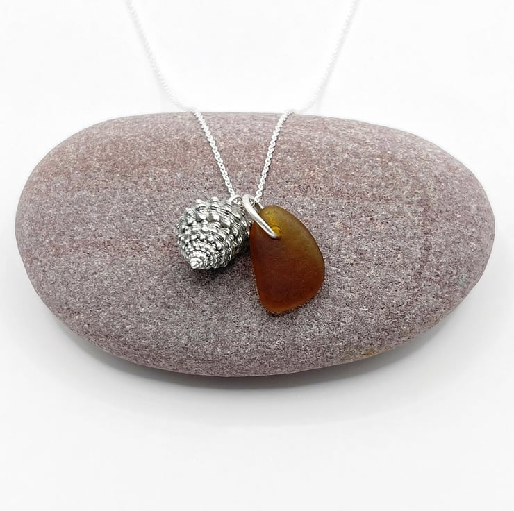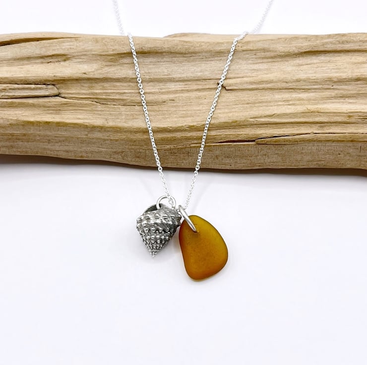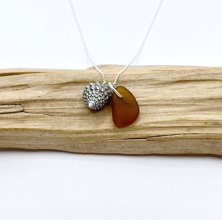 Silver coated Strawberry Top Seashell paired up with a piece of burnt orange coloured Cornish Sea Glass on an 18" Eco sterling silver fine chain necklace.