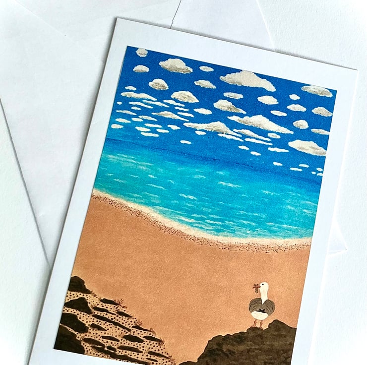 Vibrant colours in my own style showing blue sky and fluffy clouds, turquoise sea with white surf, smooth sandy beach and rocks in the foreground.