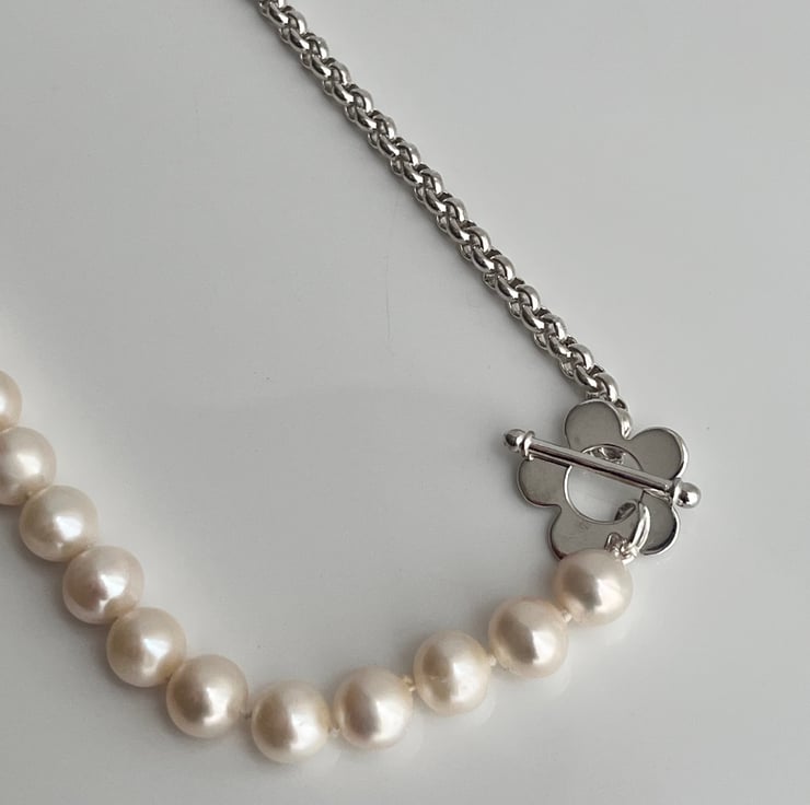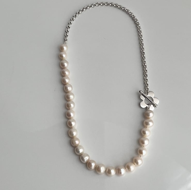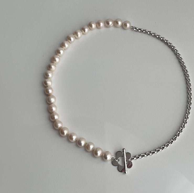 Classic meets contemporary in this half-and-half necklace featuring luminous ivory freshwater pearls on one side and a polished sterling-silver rolo chain on the other. The two strands join at a dainty, four-leaf-clover toggle clasp, letting you wear the piece front, side or back for three distinct looks.
