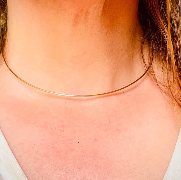 14k gold fill choker necklace. A stunning choker, looks great on. 15 inches in length and 1.2mm in thickness. 14k gold filled. A great alternative to solid gold when 14k gold is injected throughout the metal, not just on the top and lasts. The gold is permanent. A limited edition piece where only a small number will be made. My current favourite design of mine! Wrapped in patterned tissue paper. Also now available in sterling silver.