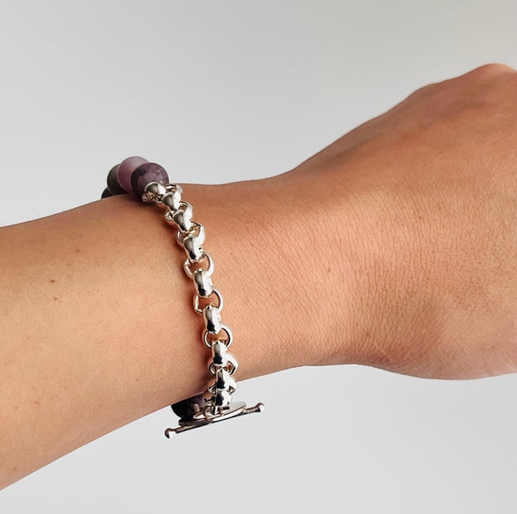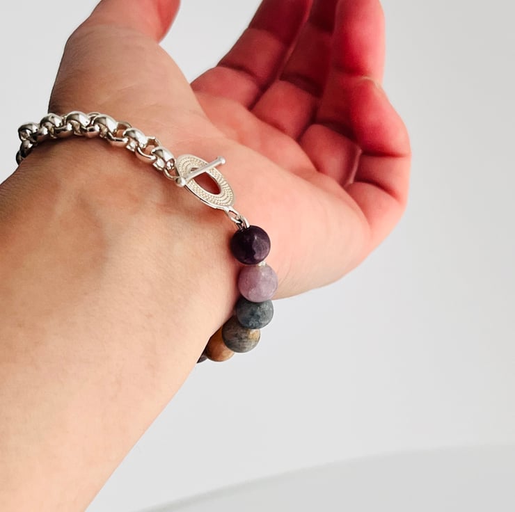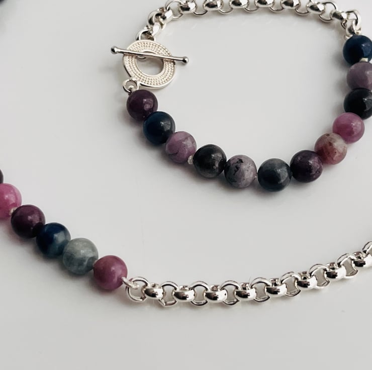 Elevate everyday outfits with this half-and-half bracelet, pairing velvety matte sapphires in dusky pinks, mauves and midnight blues with a polished sterling-silver rolo chain. A textured toggle clasp sits off-centre, letting you swivel the design for three distinct looks—pearls of colour up front, cool silver in focus, or the clasp itself as a statement accent.