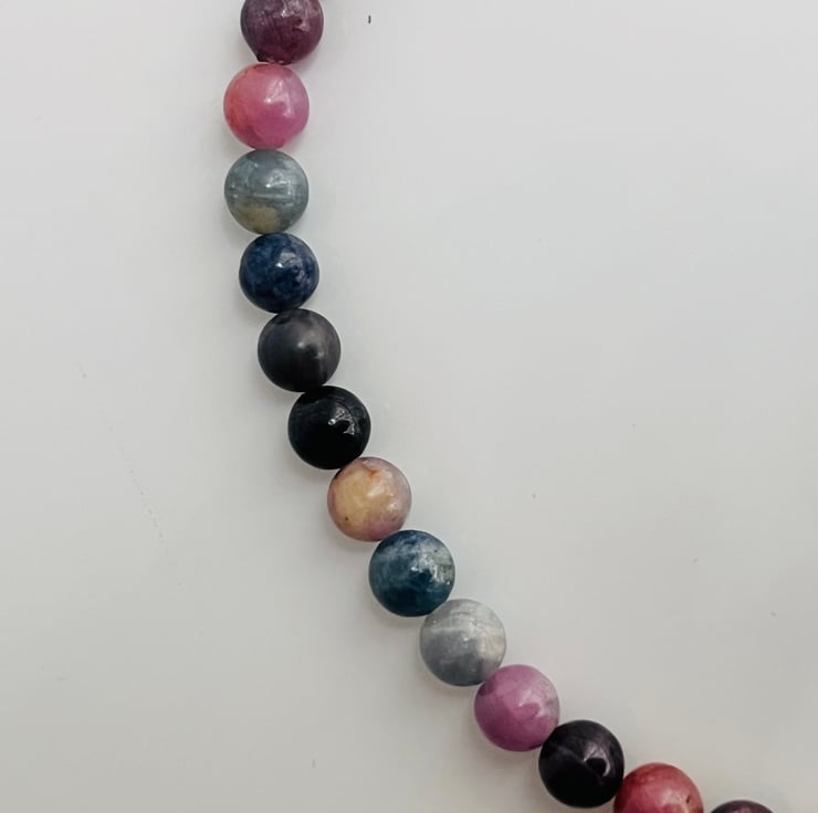 - 8 mm natural, untreated multi-colour sapphire beads – softly mattified to reveal their subtle, moody hues.