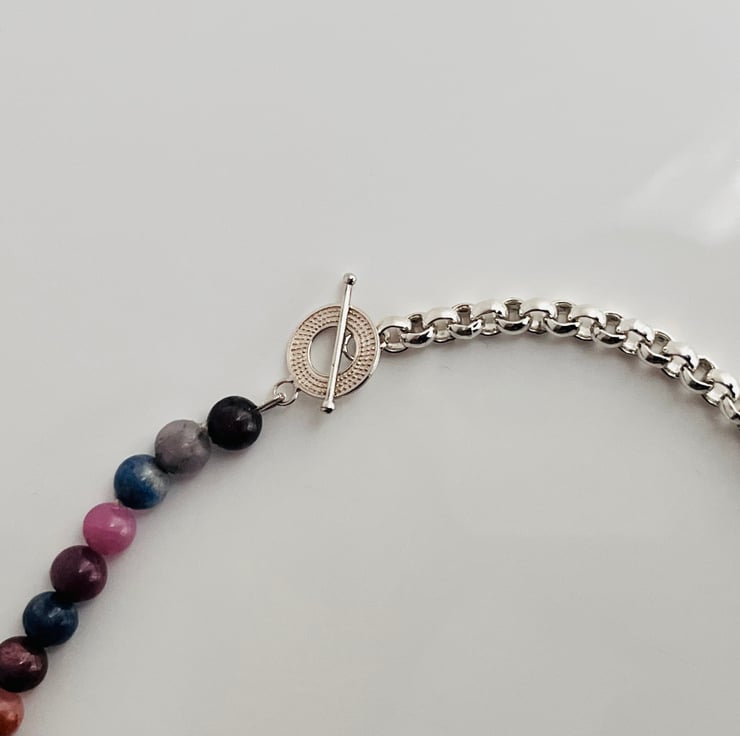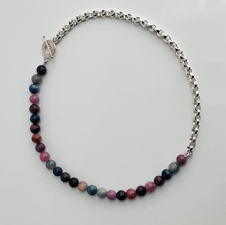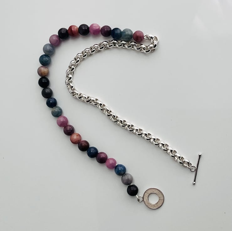 Elevate everyday outfits with this half-and-half necklace, pairing velvety matte sapphires in dusky pinks, mauves and midnight blues with a polished sterling-silver rolo chain. A textured toggle clasp sits off-centre, letting you swivel the design for three distinct looks—pearls of colour up front, cool silver in focus, or the clasp itself as a statement accent.