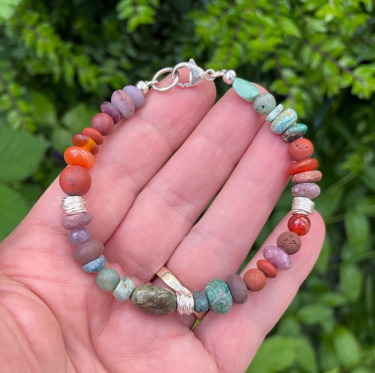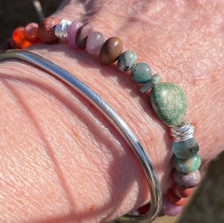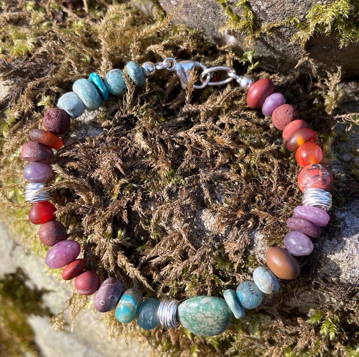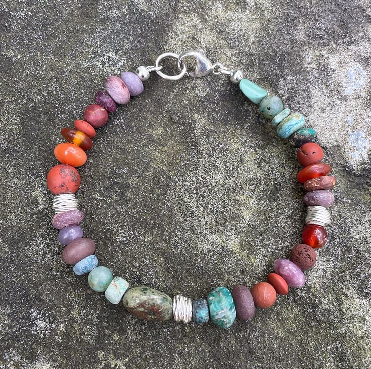 I have mixed beads in orange and terracotta with turquoise blues and some plums, there are 3 fine silver wire wrapped nest beads. The bracelet closes with a large silver trigger clasp.