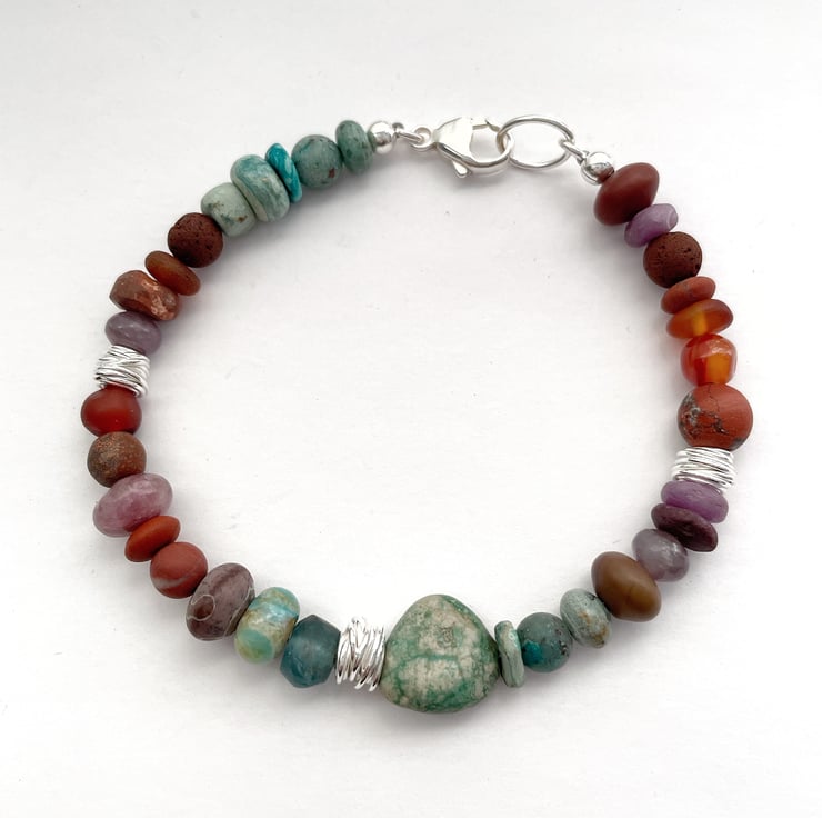 A beautiful silver and earthy bead bracelet in rust and verdigris tones.