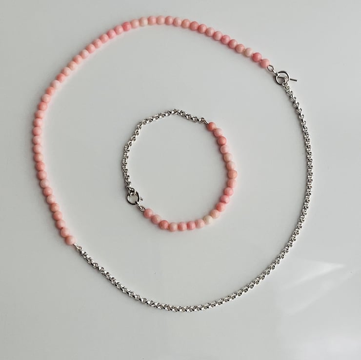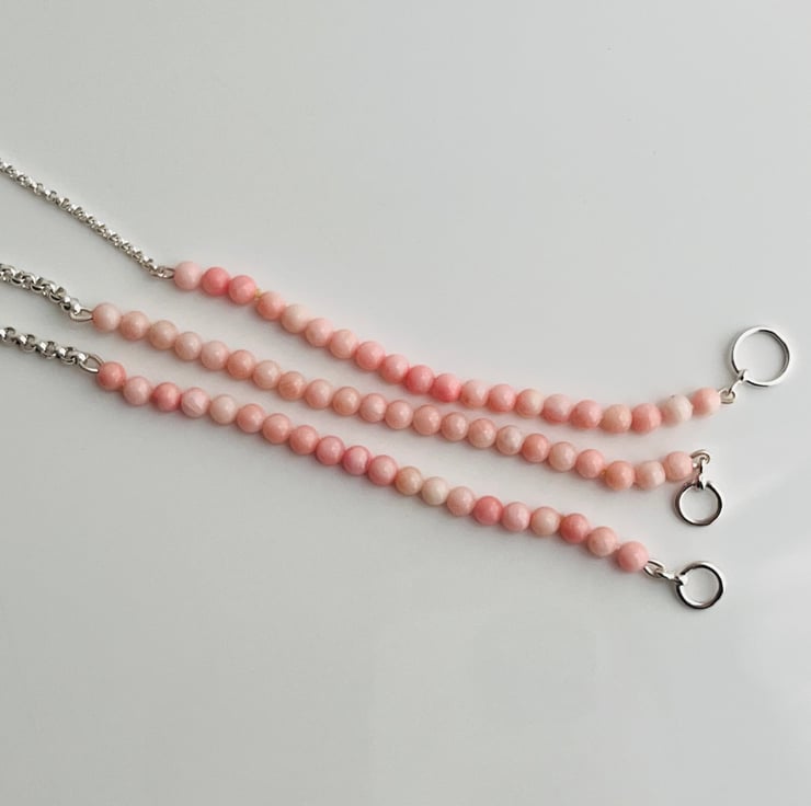 A fresh twist on the classic bead bracelet: blush coral beads wrap half the wrist while a gleaming sterling-silver rolo chain completes the circle, fastened with a textured bolt-ring clasp that is easy to secure one-handed. Perfect on its own or stacked with bangles and watches.