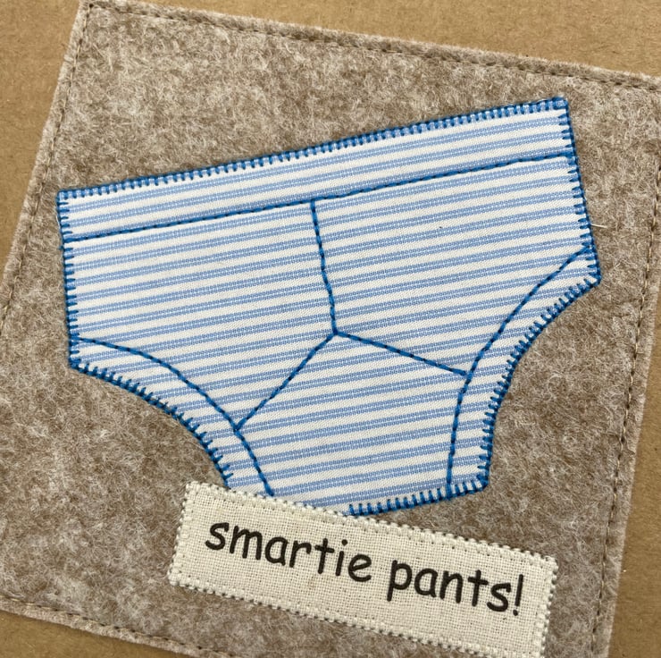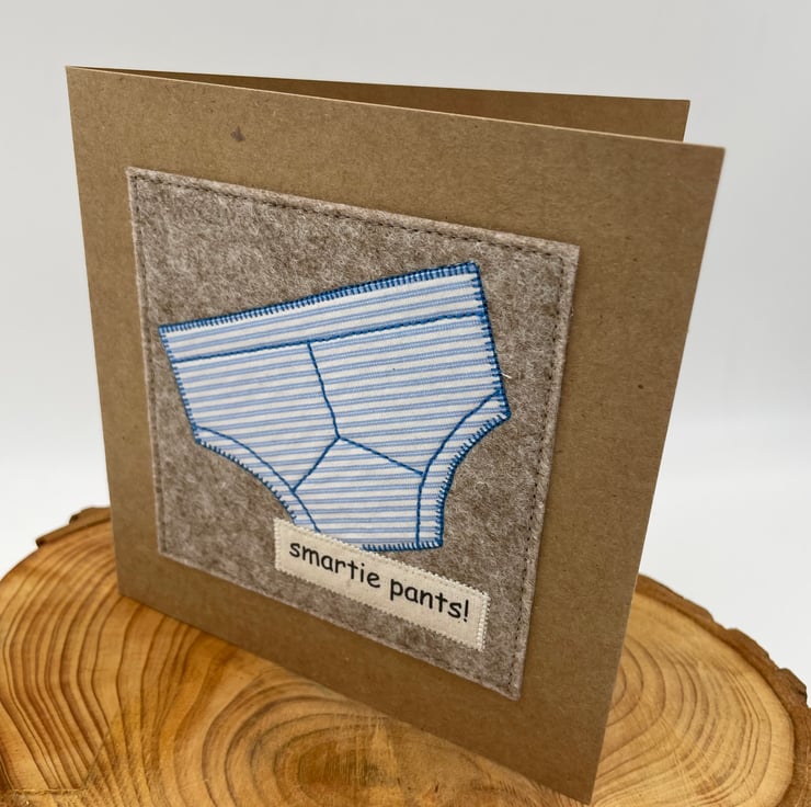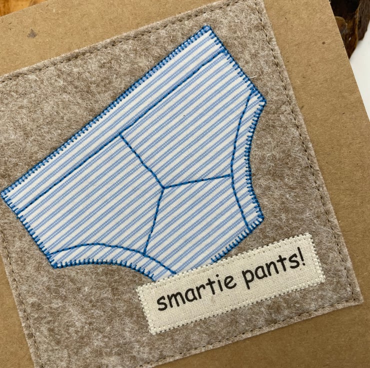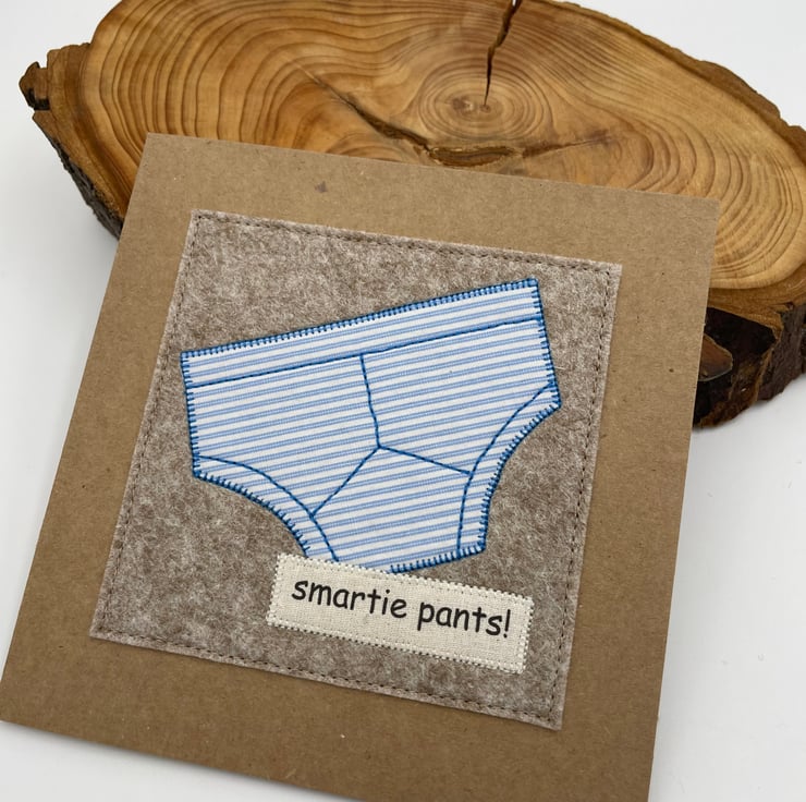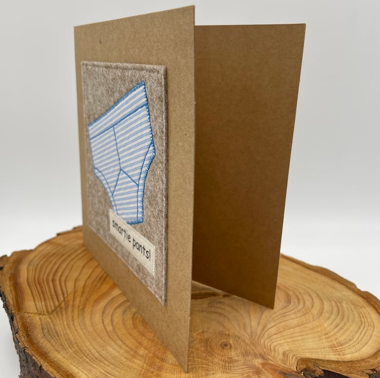 A cheerful wee card to celebrate clever clogs and big brains — with a fun appliqué and a cheeky "Smarty Pants" message to bring a smile to their face. Perfect for graduations, exams, or any smart cookie moment!