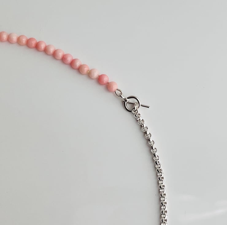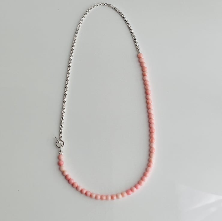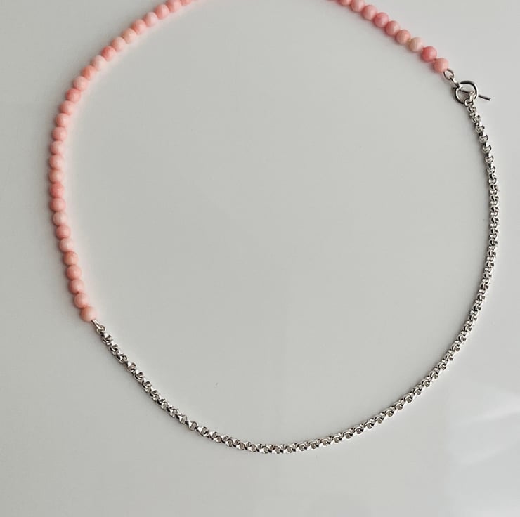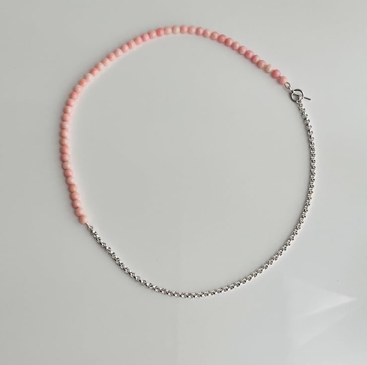 Blend soft romance with cool polish in this half-and-half necklace featuring powder-pink coral beads on one side and a bright-cut sterling-silver rolo chain on the other. A discreet bolt-ring clasp sits off-centre so you can style the piece three ways—coral forward, chain forward, or with the clasp as an accent.