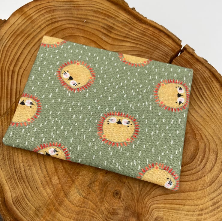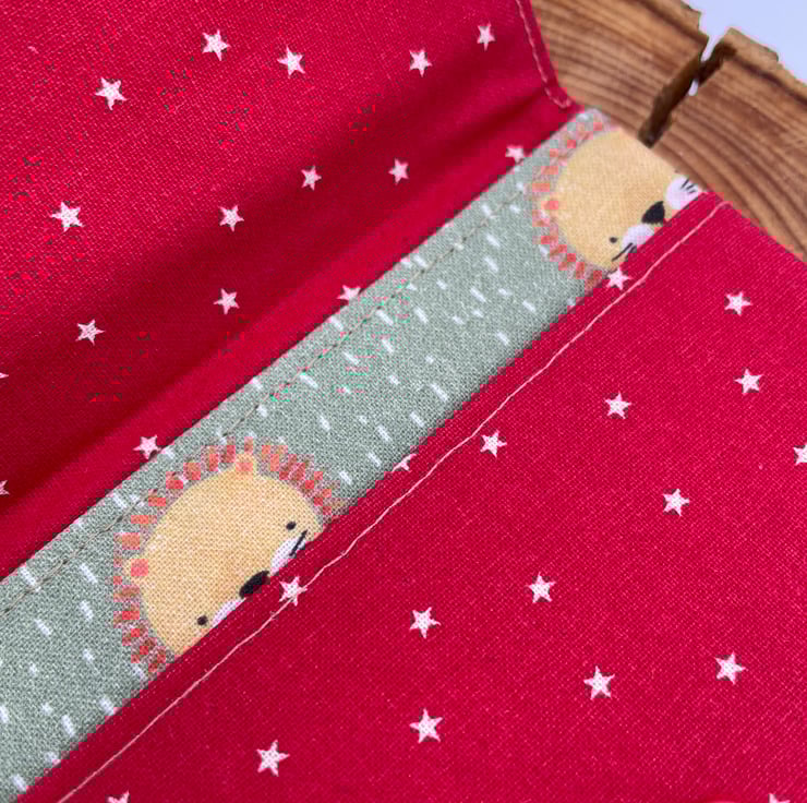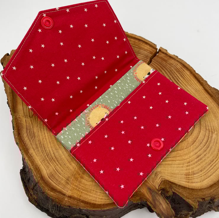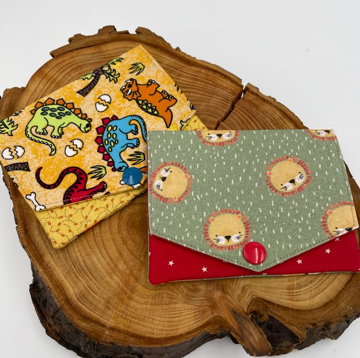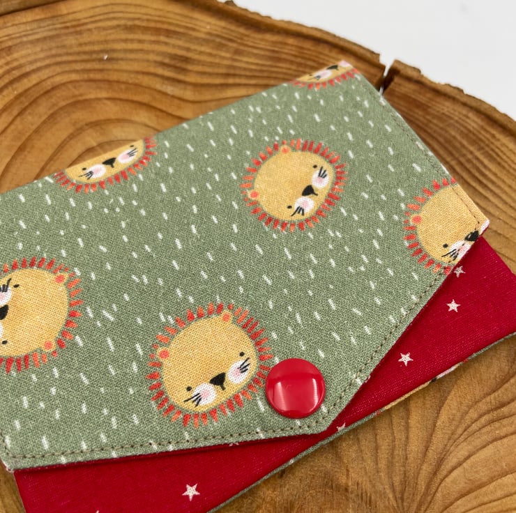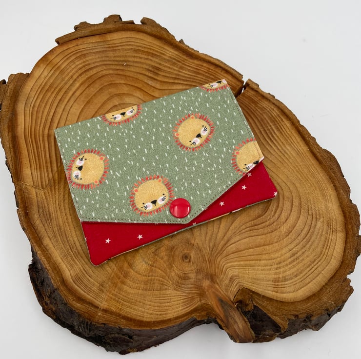A cheerful little fabric purse made from cute lion print with a contrasting star lining. Just the right size for pocket money, cards, or little treasures — with a snap fastener to keep everything safe and sound.