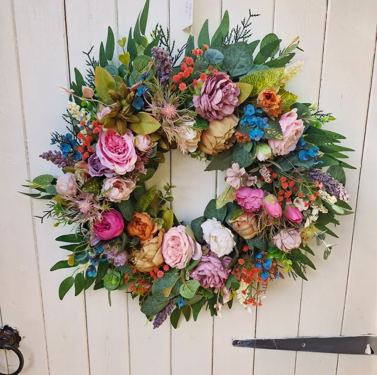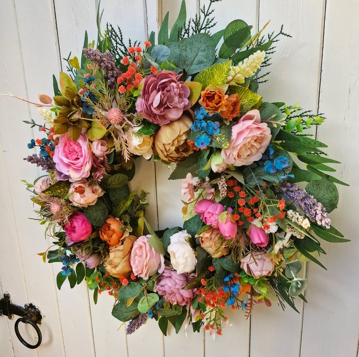 Beautiful handcrafted vintage style mixed premium faux dusky floral peonies & Roses 50cm hanging wreath. Add a touch of elegance to your home with this everlasting bloom