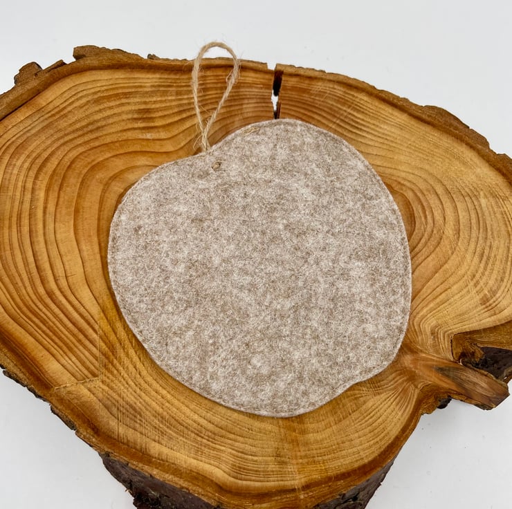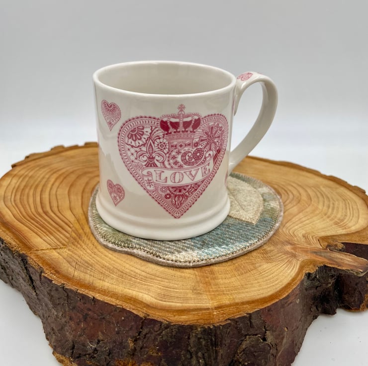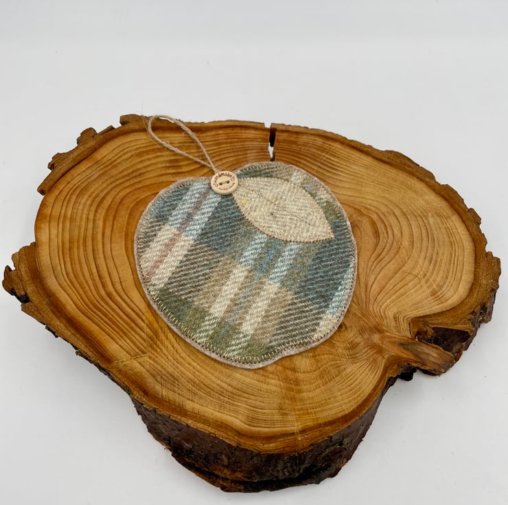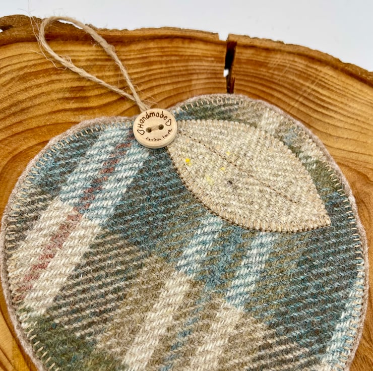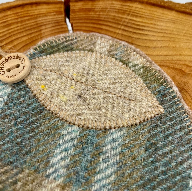 This wee apple-shaped mug rug is stitched from rich Scottish tweed, giving it a warm, woolly feel straight from the Highlands. It’s finished with a soft appliqué leaf, a rustic twine stork, and a sweet little “handmade with love” button—just the right mix of charm and comfort for your morning brew or afternoon tea.