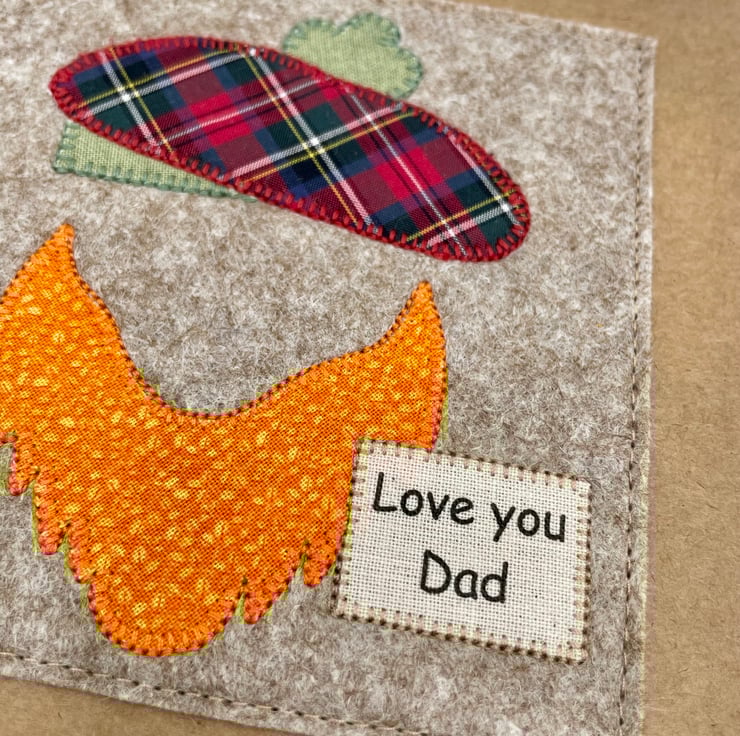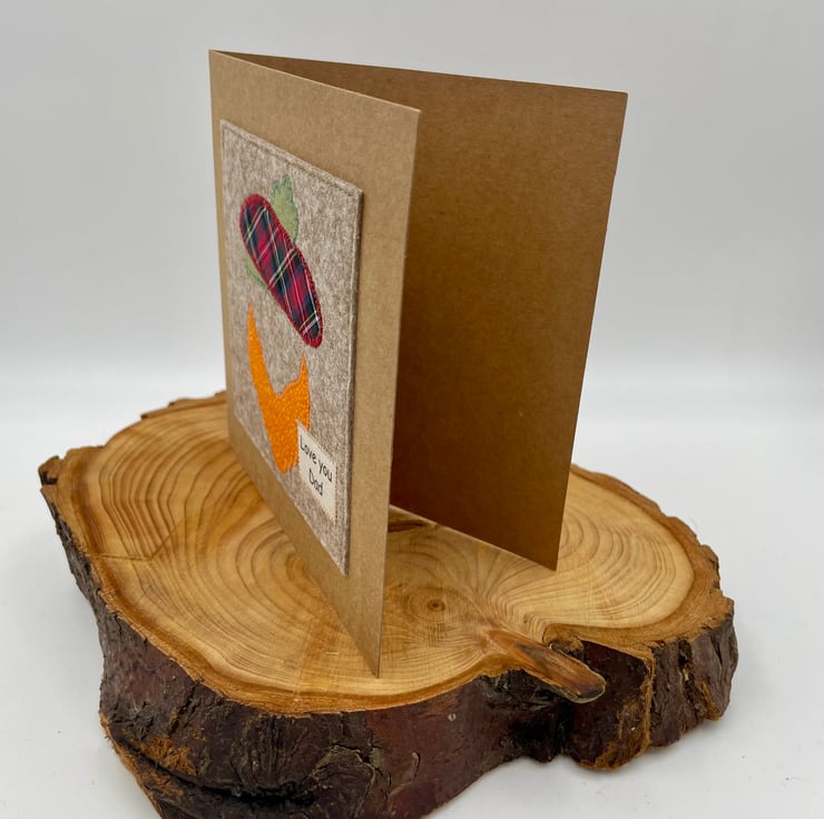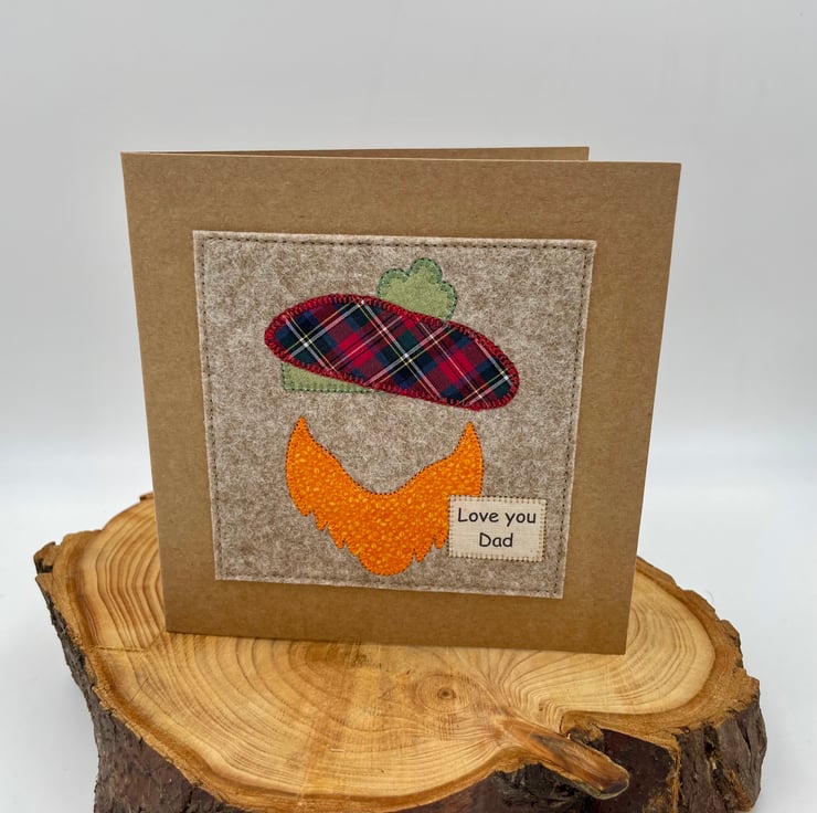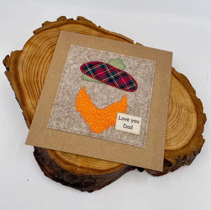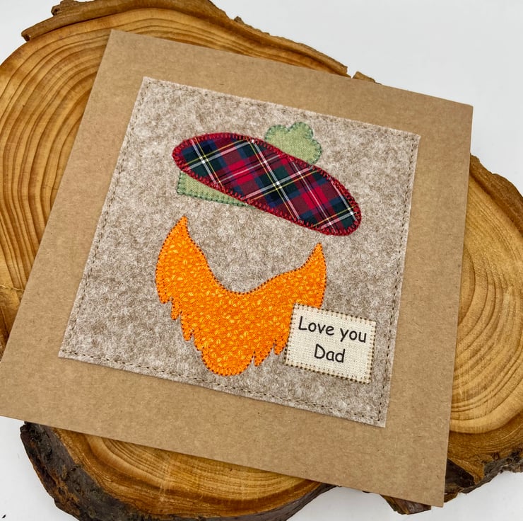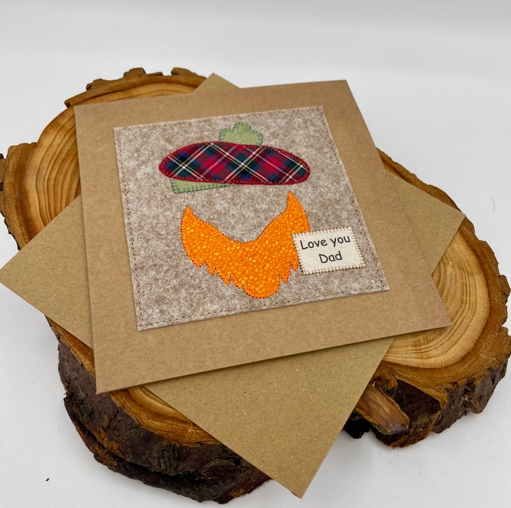 A wee Scottish-themed card to say ‘Love You Dad’, complete with a tartan appliqué beret and a big ginger beard. A fun and heartfelt way to celebrate him on Father’s Day or his birthday.