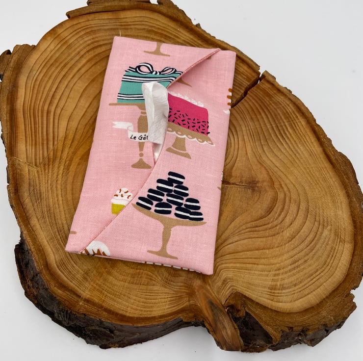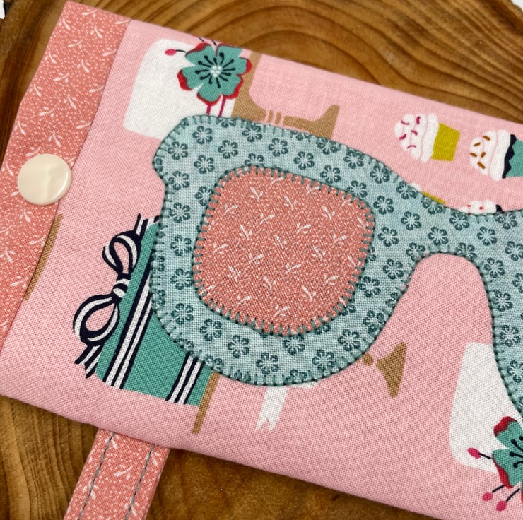 A sweet and sturdy glasses case made from yummy cake-print fabric, topped with a stitched appliqué of spectacles for a playful touch. Keeps your specs safe with handmade charm!
