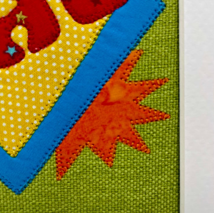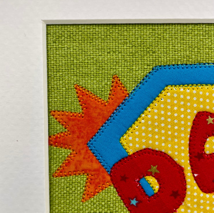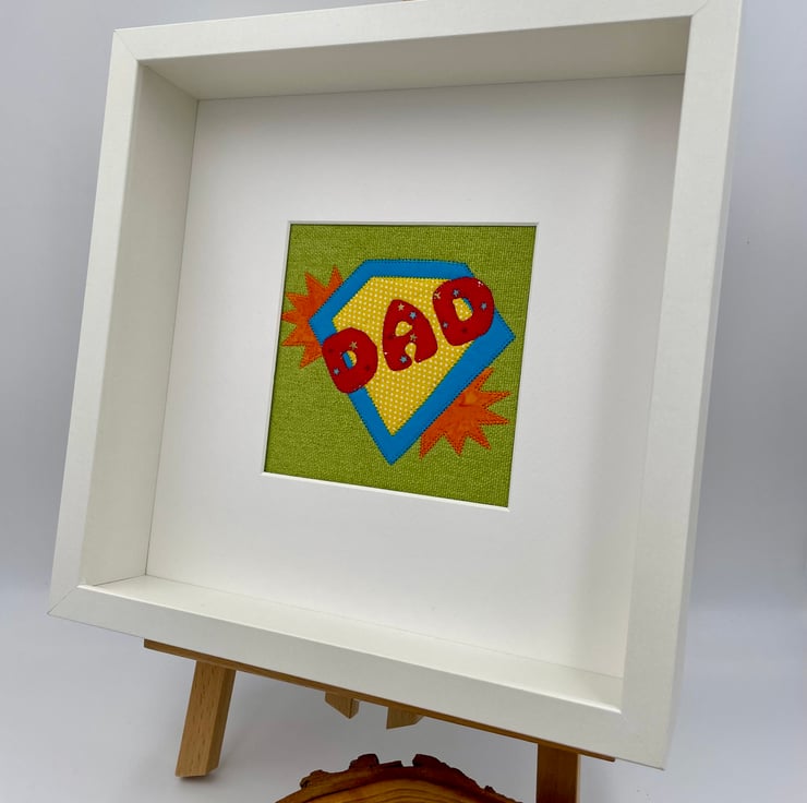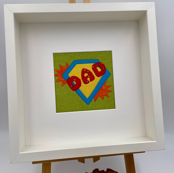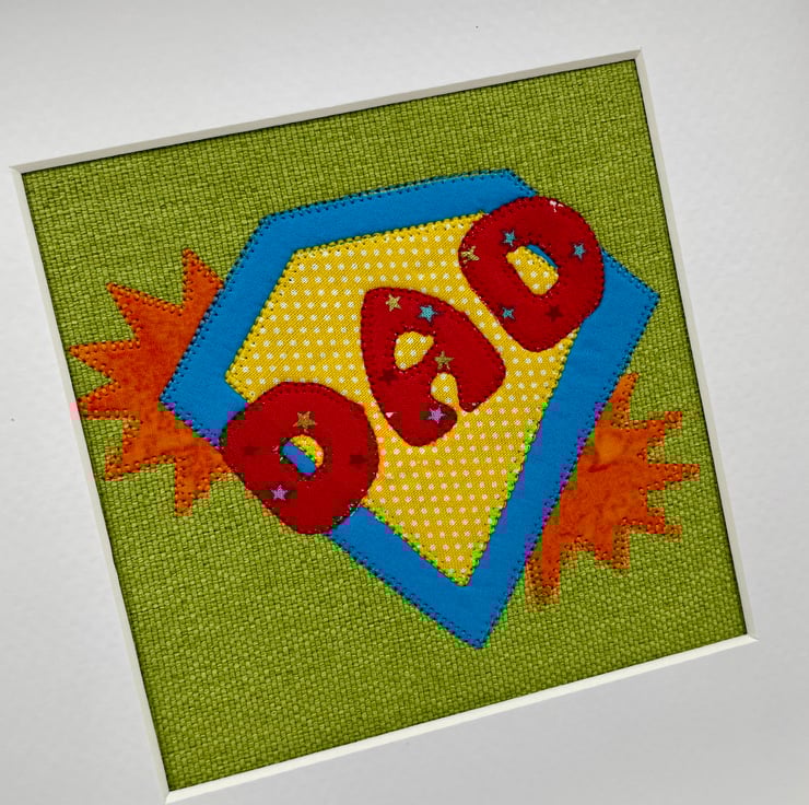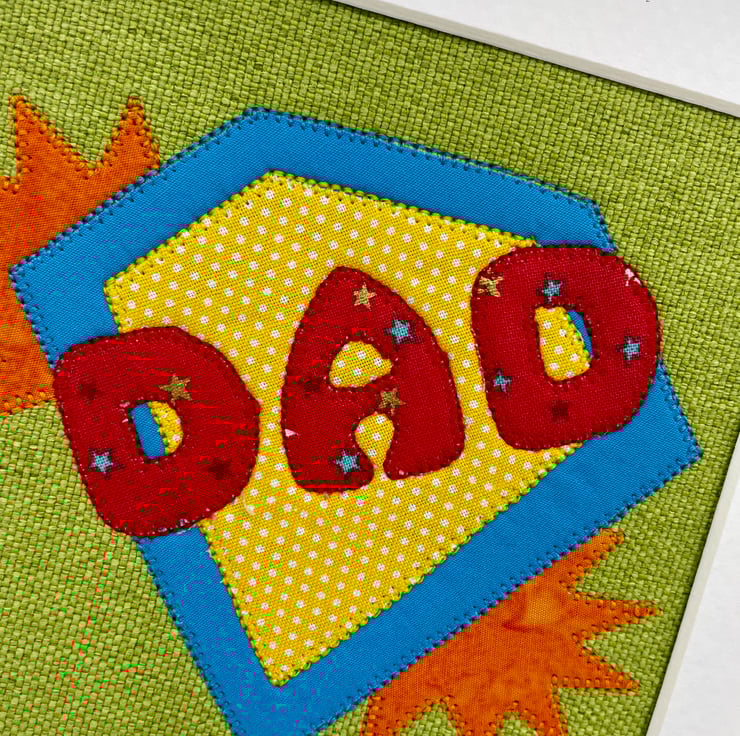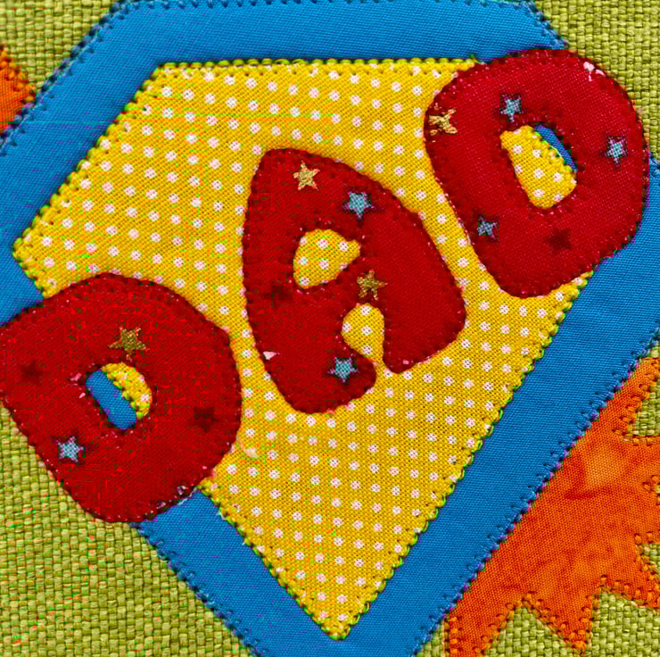 Bursting with love and comic-book flair, this cheerful appliqué picture of 'DAD' is a real showstopper! Designed in a classic 'kerpow' style, it's a fun, vibrant tribute to the superhero in your life. Bold letters in bright reds, electric blues, and sunshine yellows leap off the fabric with stitched bursts and starbursts that pack a punch. Whether it's for Father's Day or his birthday, this joyful piece is sure to make him smile from ear to ear. A handmade hug in technicolor!
