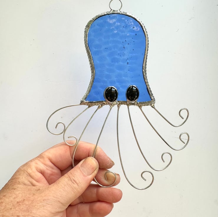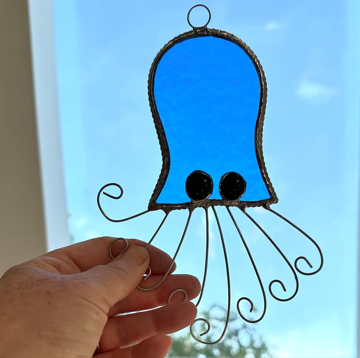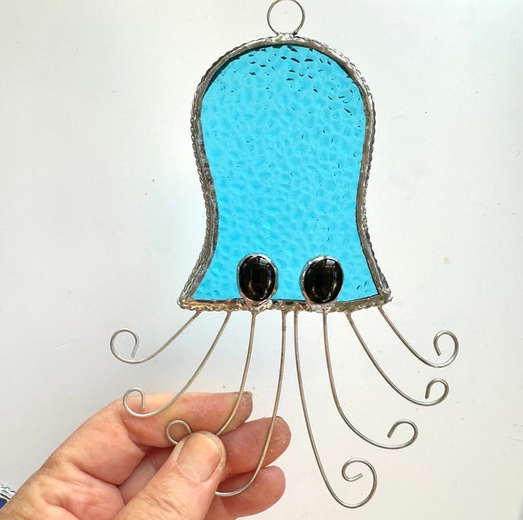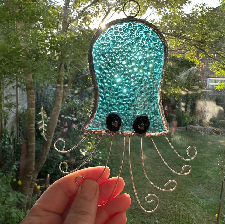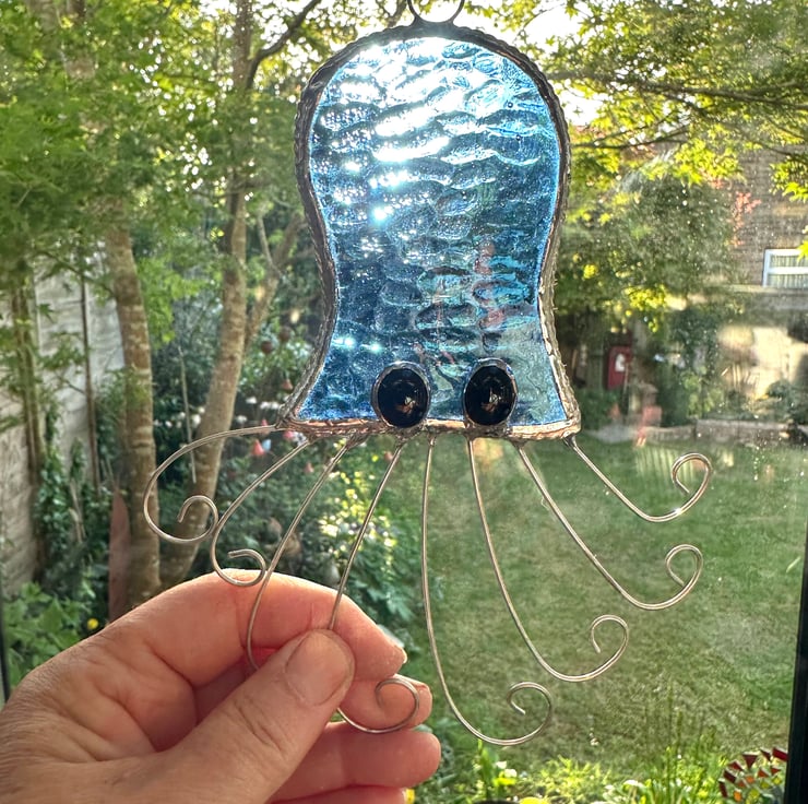 These suncatchers have been made by hand. Each piece of glass has been hand cut, ground, washed and foiled then soldered together before being washed and polished. I have added a boarder of tinned twisted wire for decoration and added strength. The tentacles have been made from tinned twisted wire and the eyes from grape glass nuggets.