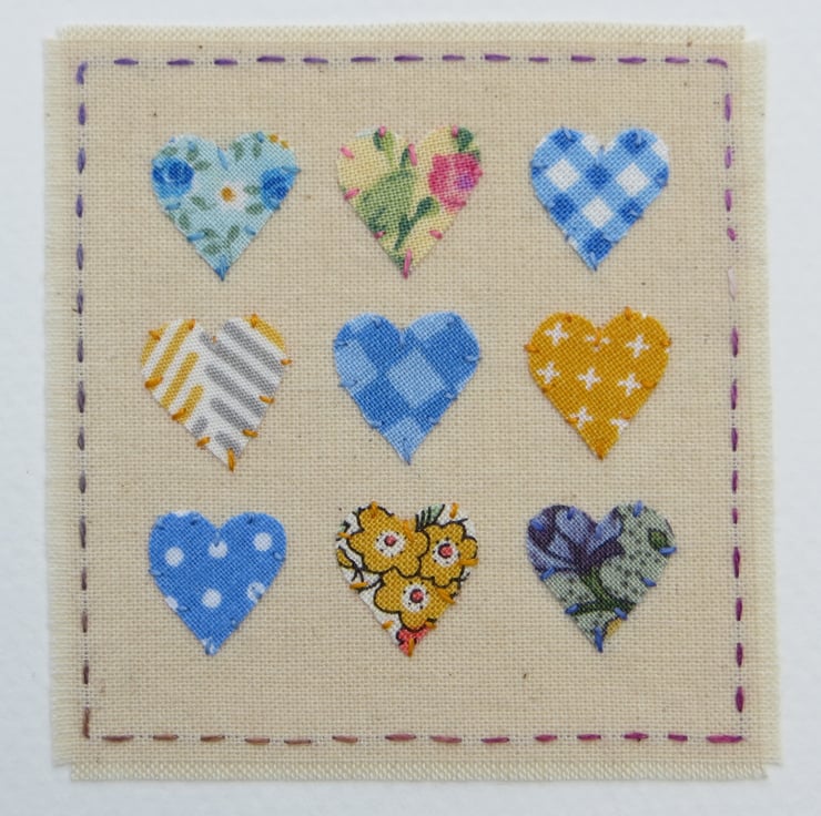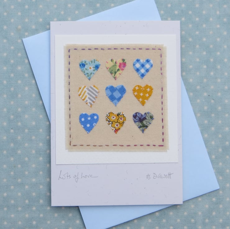 I love to collect pretty cotton prints to use in my work, and try to use every piece of the fabrics, even the littlest bits left over from larger projects. I carefully select from these pieces to put together the nine little hearts for my 'Lots of Love' cards. Every one is unique and stitched by hand. Ten stitches in each heart, well over a hundred stitches in every card - including the border.