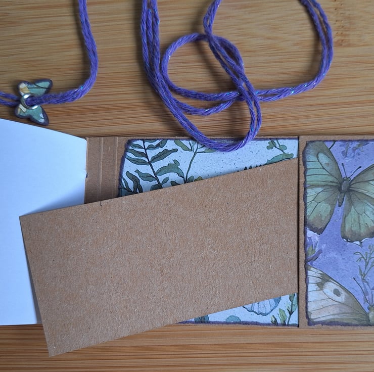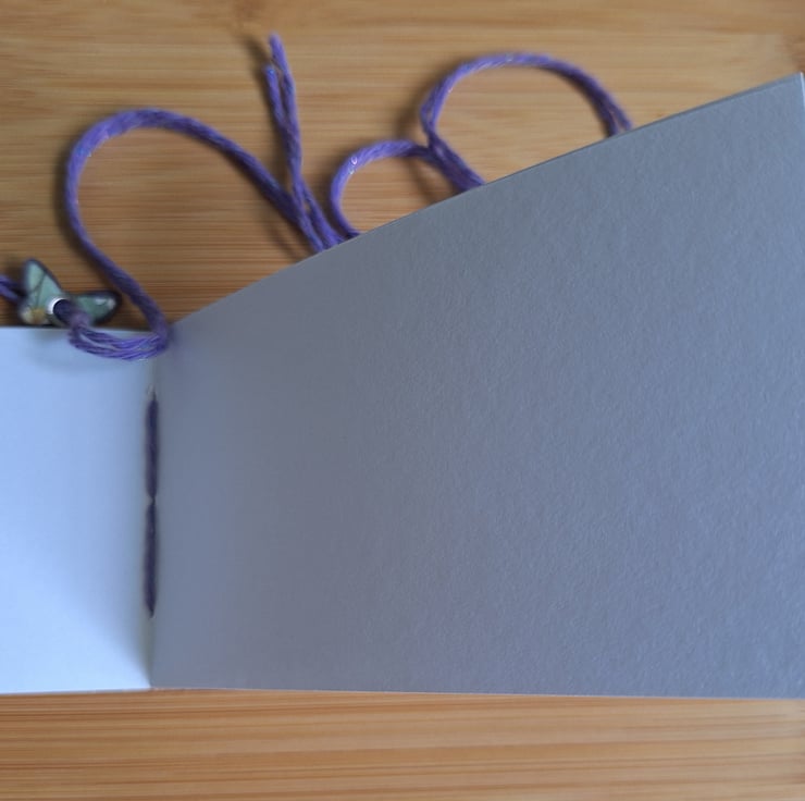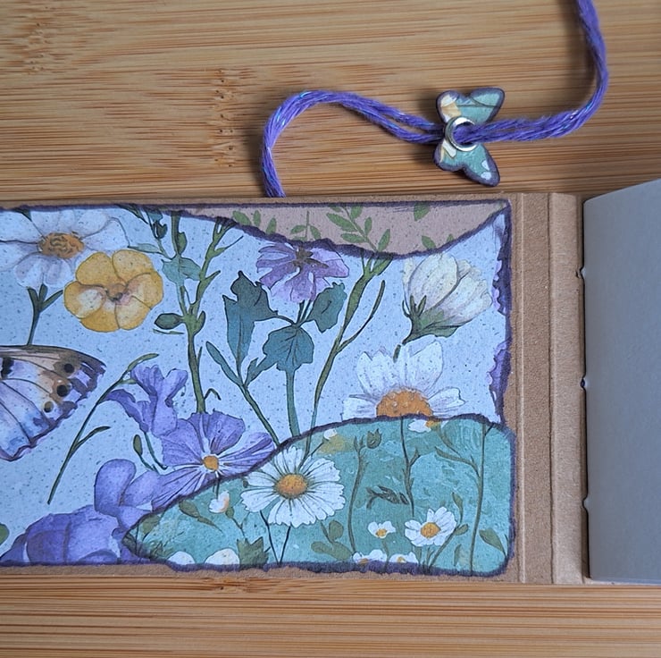 A handy little landscape journal measuring 3 inches by 6 inches (7.5 cm by 15 cm approximately). 40 sides of white paper perfect for sketching or writing (I have also used the paper for painting. Depending on the medium used there may be some paper buckling). Handmade using Kraft card, and digitally purchased and printed decorative papers (the same paper as used for the pages). Three hole binding using craft cotton, which then wraps around the journal to keep it closed. A little butterfly is a decorative feature.