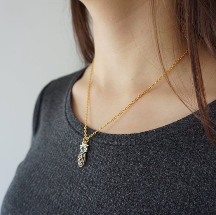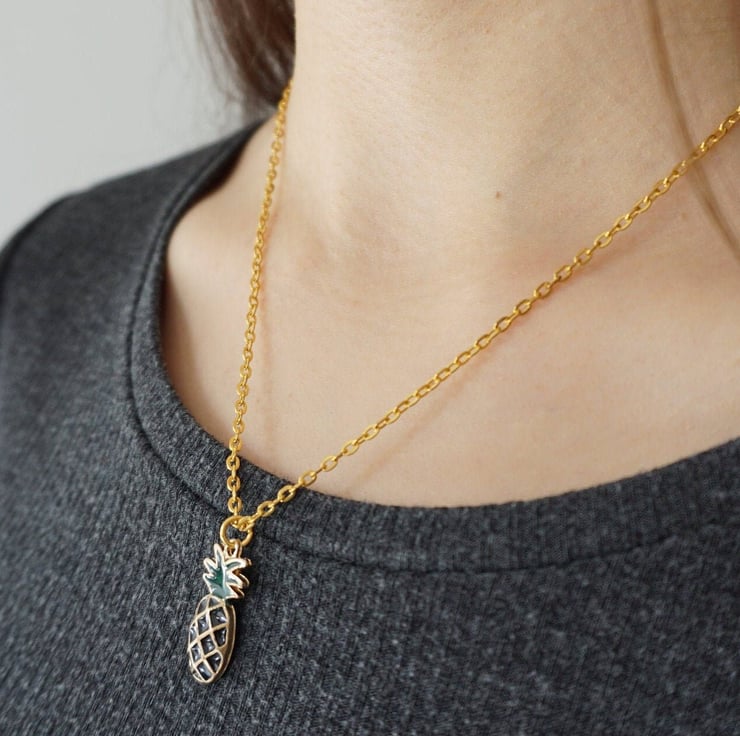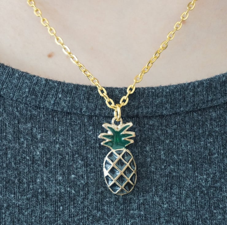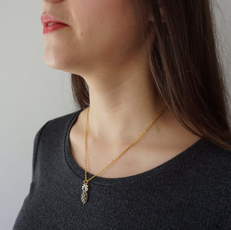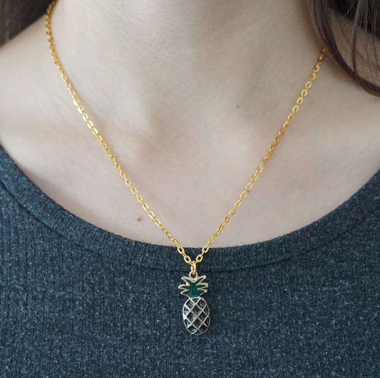 Cute pineapple pendant with a stainless steel gold coloured chain and a lobster claw adjustment that will compliment any summery outfit.