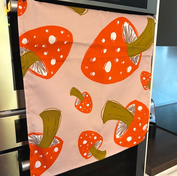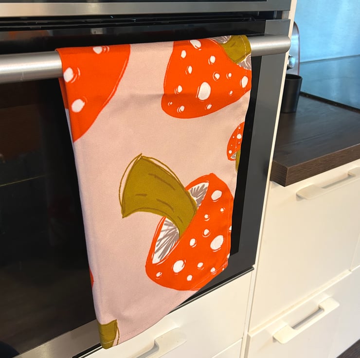 Fun Design: Our tea towel is adorned with a colourful mushroom pattern, making it a joyful addition to any kitchen.