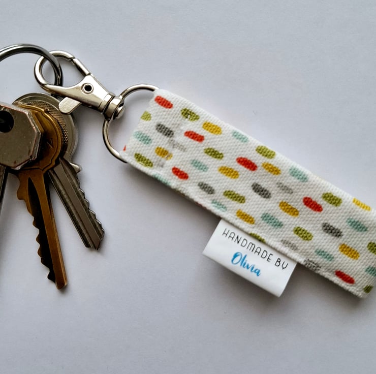 This handmade micro keyring was created using cotton canvas fabric with a cream background and hints of orange, green, light blue, yellow and grey. A lovely accessory that could be clipped onto a handbag or used as a keyring and would make a nice handmade gift.