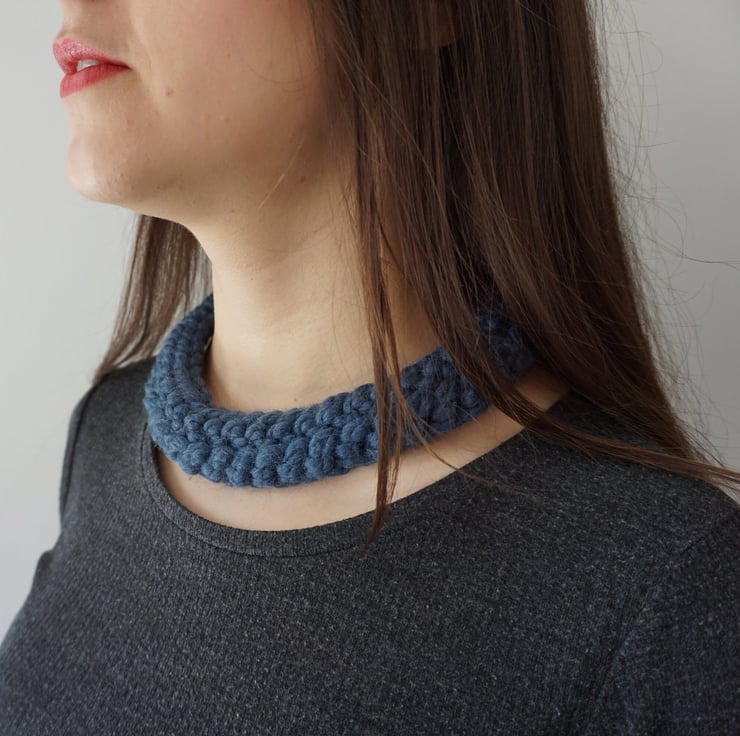 Lovingly handmade from dark blue acrylic chunky yarn, titanium cable chain, lobster claw fastening and a chain extender to adjust length of necklace.