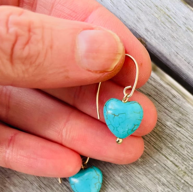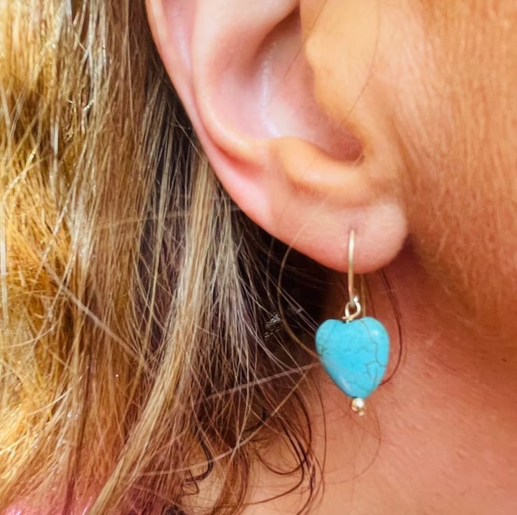 9ct Gold Earrings with Turquoise Gemstone Heart Drops The turquoise hearts are approx 12mm in size so a good sized heart. Very pretty earrings in a great colour combination. Free gift box tied with ribbon.