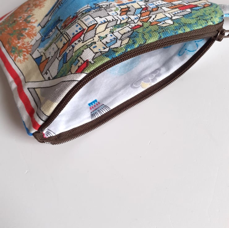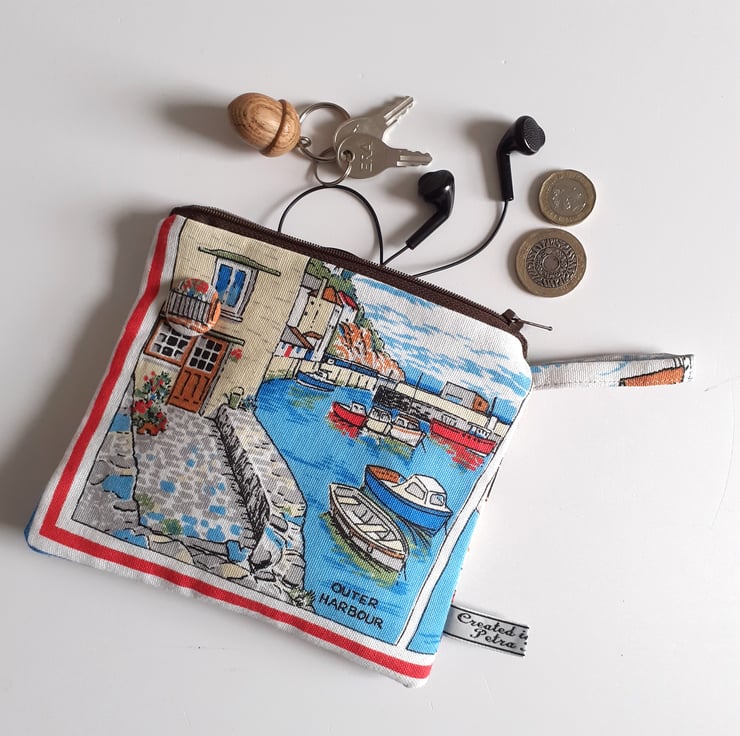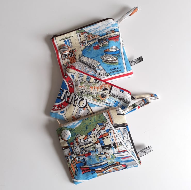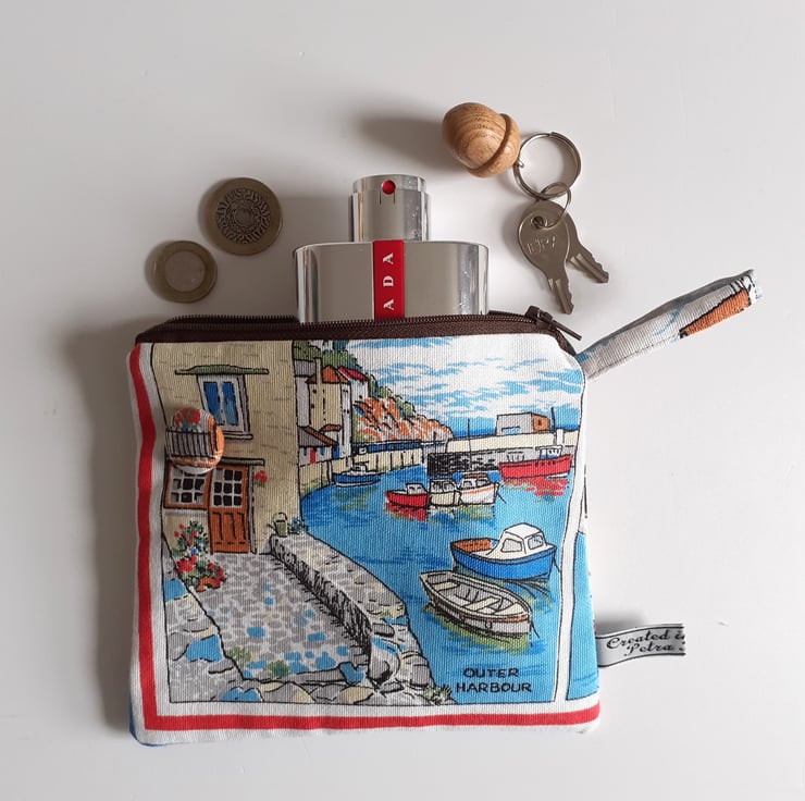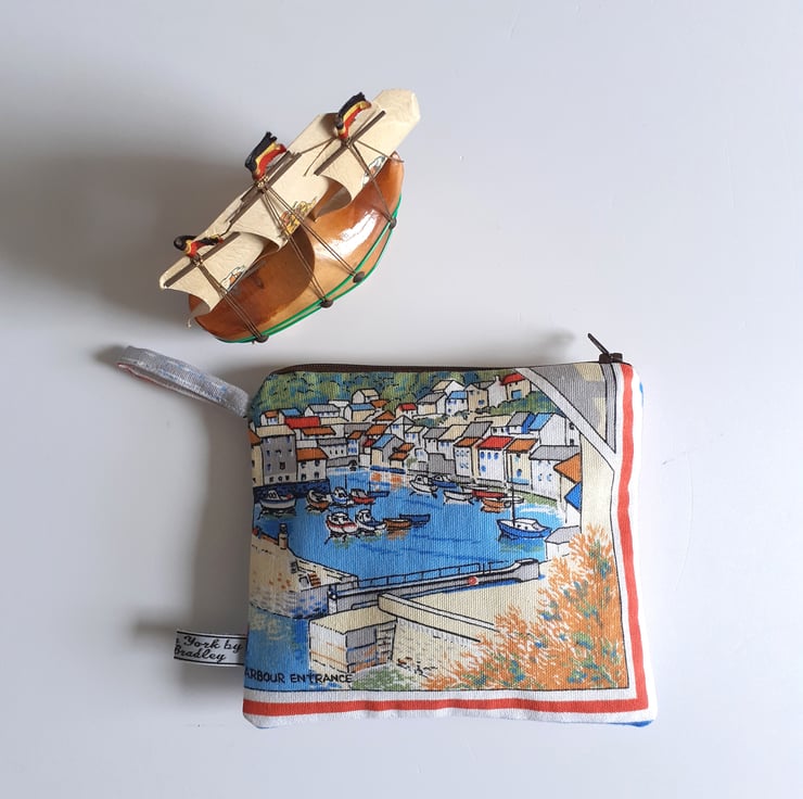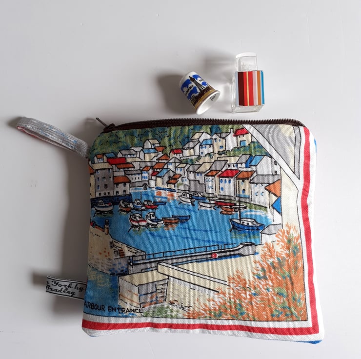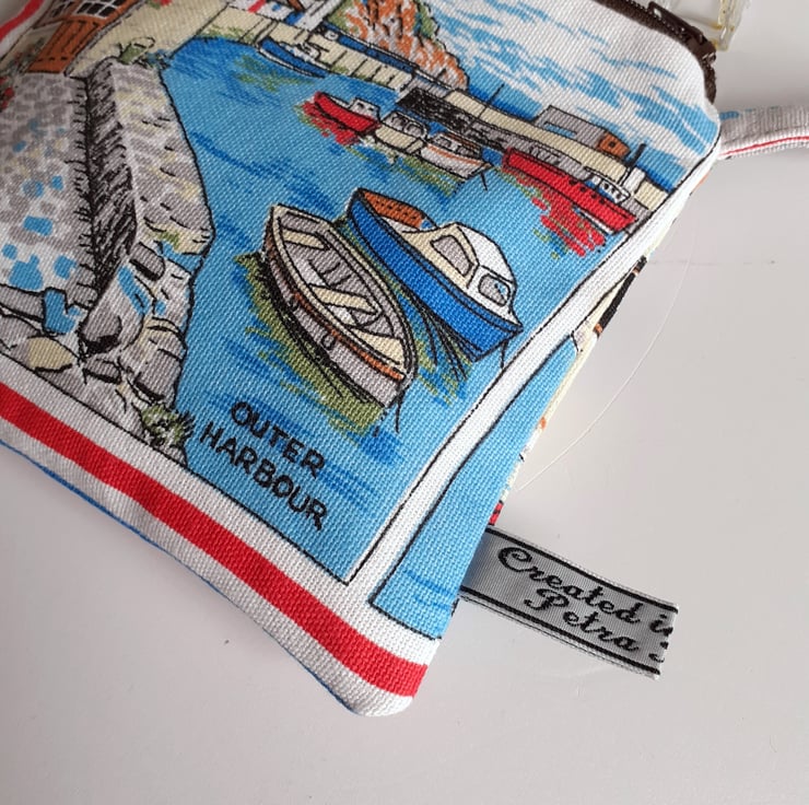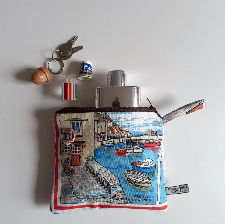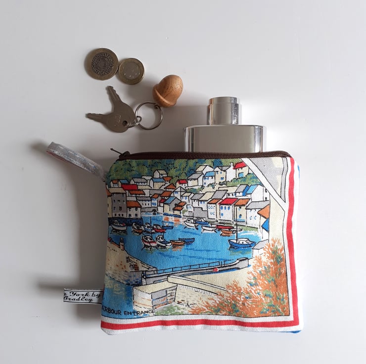 Cornwall on your purse ! This vintage tea towel featuring Polperro harbour in Cornwall was perfect for creating some little pouches, storage or make up bags. This one features a lovely illustration of the outer harbour on the front, and the harbour entrance on the back. These little bags are always useful for organising your ruck sac, for storing your buds or headphones or for your holiday money! They make a great present for a friend going away to Uni, as a present for Dad or anyone who loves or is pining for this part of Cornwall.
