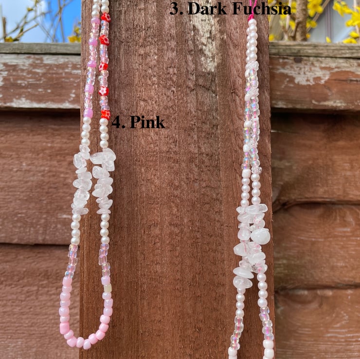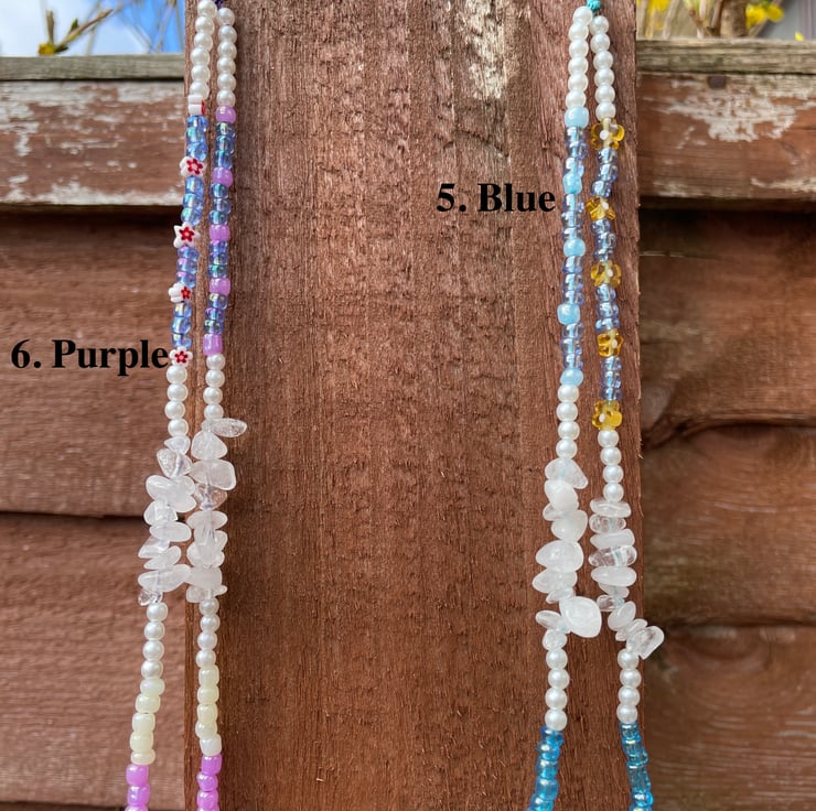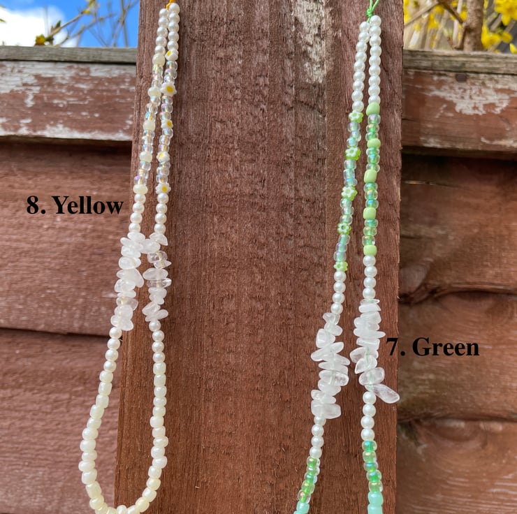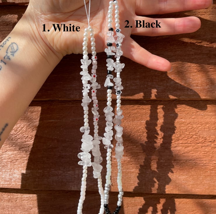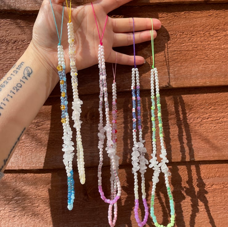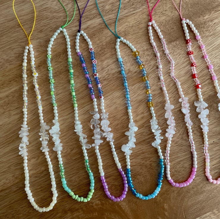 Each phone strap made with polyester cord, faux acrylic pearl, flower glass bead, coloured glass bead, clear quartz