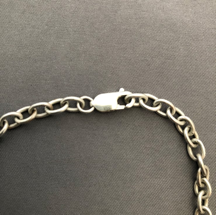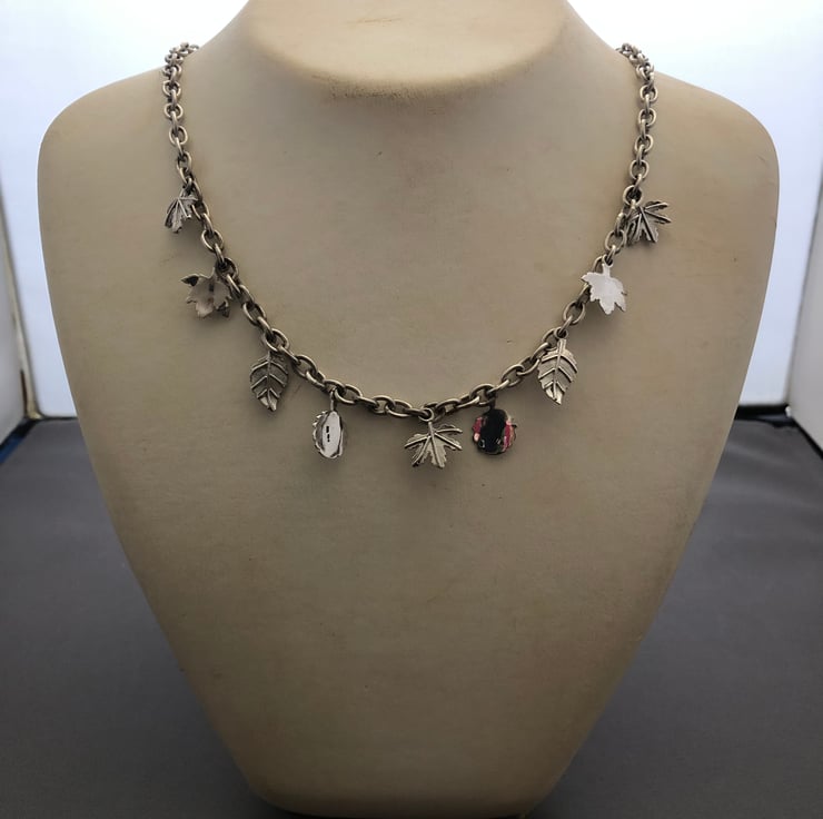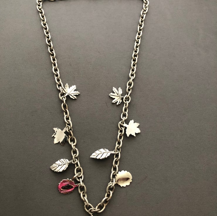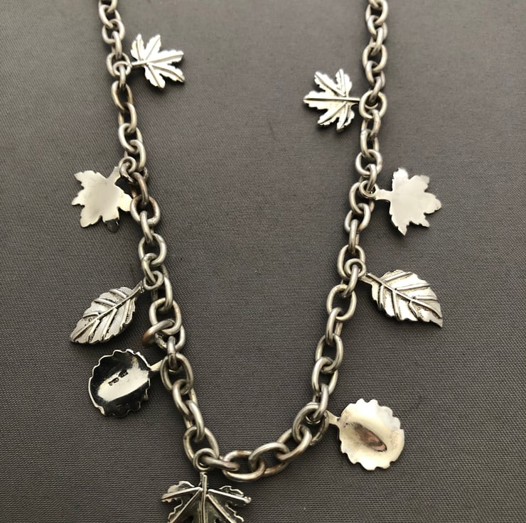 Ladies solid sterling silver leaf chain, on this chain you have got 4 different leafs charms on the chain, the weight of this chain is 31 grams length of this chain is 18.6 inches and can be made longer or shorter.