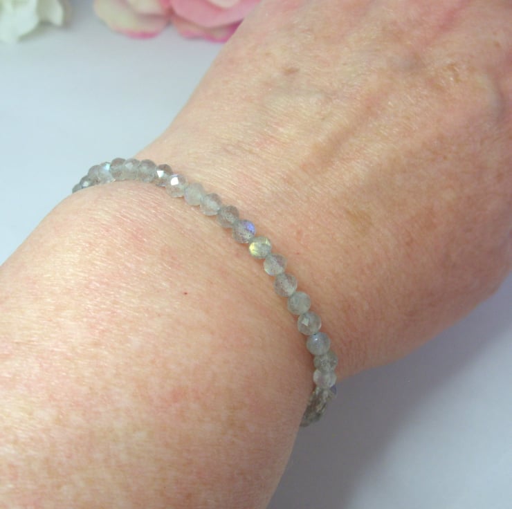 The faceted cut of the Labradorite beads reflects the light, making the bracelet sparkle & shows off the famous Labradorite shimmer.