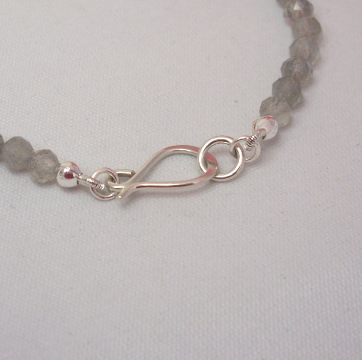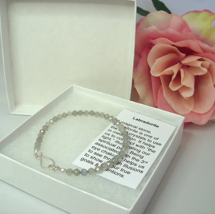 This delicate Labradorite gemstone bead bracelet features small faceted beads and a secure hook and eye clasp.
