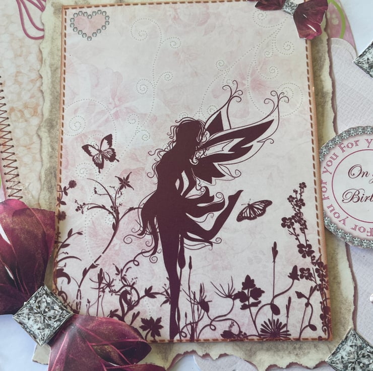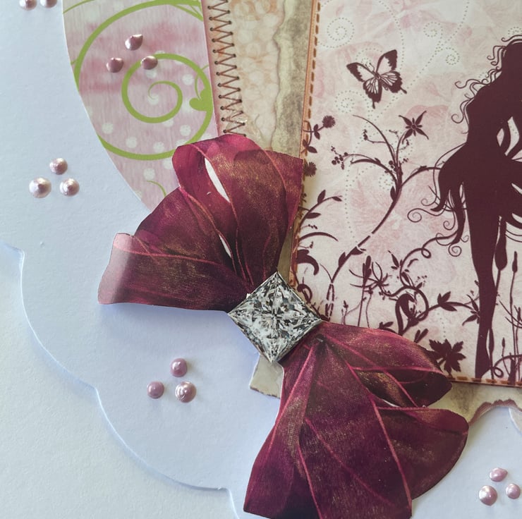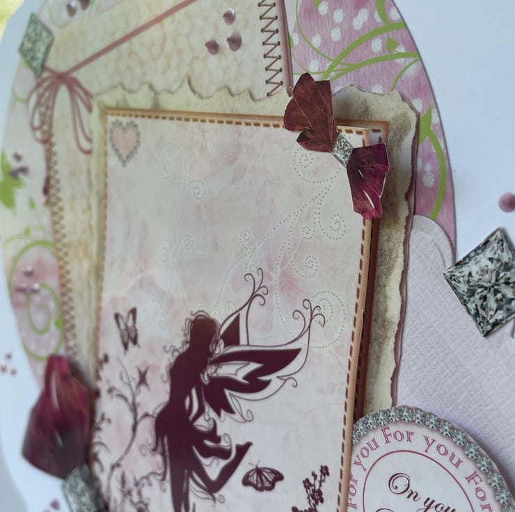 A pretty fairy card to wish someone a happy birthday. This unusual scalloped circular card is approximately 20cm in diameter. It has a pretty edge and is topped with pretty swirly and stripey papers cut into matching circles. The main design has a silhouette of a dancing fairy with flowers and butterflies. The design is enhanced with paper bows, gems and a Happy Birthday greeting. The design is finished with pink pearly drops. Inside the card has a greeting that says Best Wishes. A very pretty card.