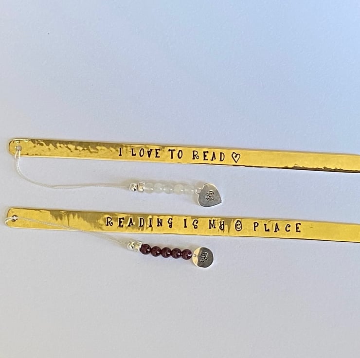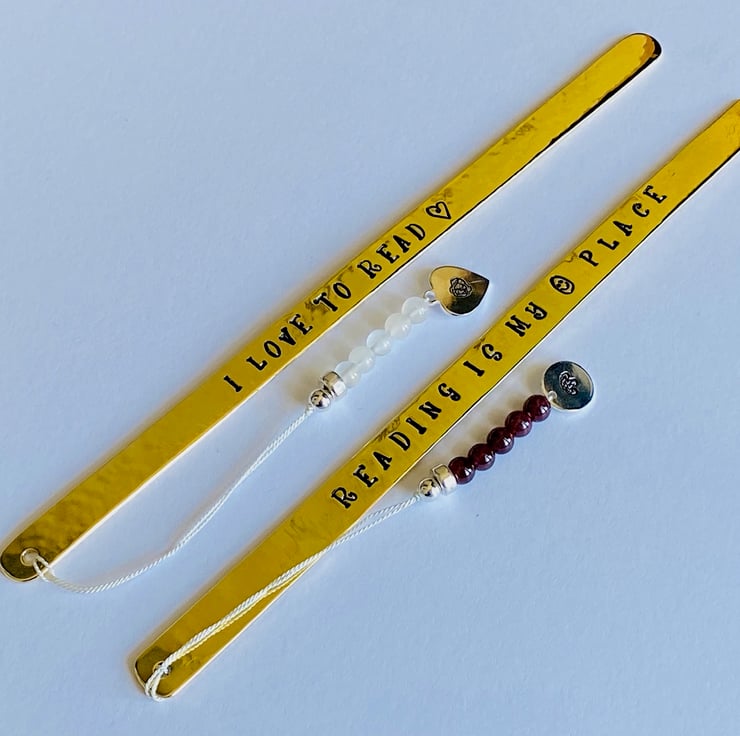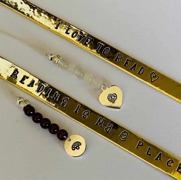 I have created the bookmark from a 6 inch piece of brass, I have made a hole in one end and fixed silk cord with 5 gemstone beads alongside silver beads to secure and a small silver charm. The bookmarks have been hand stamped.